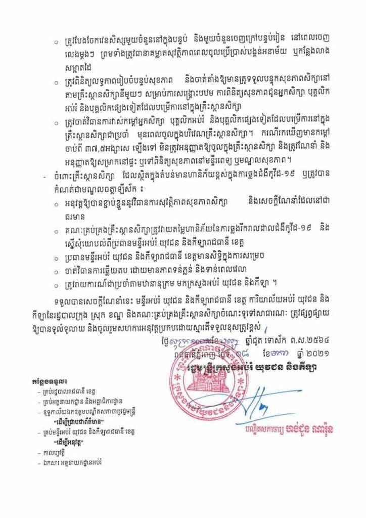 សាលារៀនត្រូវបន្តអនុវត្តឱ្យបានខ្ជាប់ខ្ជួននូវសេចក្តីណែនាំ និងសេចក្តីជូនដំណឹងដែលនៅមានសុពលភាព រួមមានគោលការណ៍ប្រតិបត្តិស្តង់ដា (SOP) សម្រាប់ដំណើរការសាលារៀនឡើងវិញក្នុងបរិបទកូវីដ-19 និងគោលការណ៍ប្រតិបត្តិស្តង់ដា (SOP) ស្ដីពីសេវារថយន្តដឹកសិស្ស សេវាបណ្ណាល័យ សកម្មភាពអប់រំកាយនិងកីឡា សកម្មភាពសិល្បៈ និងសេវាអាហារដ្ឋាននៅតាមគ្រឹះស្ថានសិក្សាសាធារណៈនិងឯកជនក្នុងបរិបទកូវីដ-19 ។