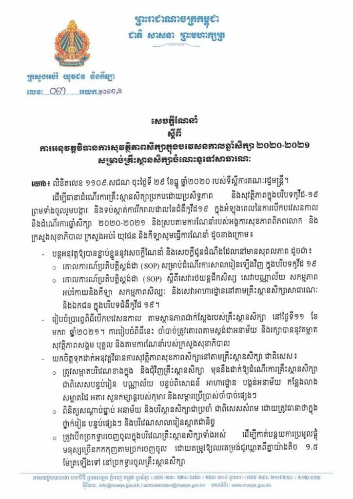 ឯកឧត្តមរដ្ឋមន្ត្រី បានបញ្ជាក់ថា ដើម្បីធានាដំណើរការគ្រឹះស្ថានសិក្សាប្រកបដោយប្រសិទ្ធភាព និងសុវត្ថិភាពក្នុងបរិបទកូវីដ-19 ព្រមទាំងចូលរួមបង្ការនិងទប់ស្កាត់ការរីករាលដាលនៃជំងឺកូវីដ-19 ក្នុងអំឡុងពេលនៃការបើកបវេសនកាលនិងដំណើរការឆ្នាំសិក្សា 2020 – 2021 គ្រប់គ្រឹះស្ថានសិក្សាចំណេះទូទៅសាធារណៈ ត្រូវអនុវត្តវិធានការសុវត្ថិភាពសិក្សា ដោយប្រកាន់ខ្ជាប់គោលការណ៍ប្រតិបត្តិស្តង់ដា (SOP)។ គោលការណ៍ប្រតិបត្តិស្តង់ដានេះ ស្របតាមការណែនាំរបស់អង្គការសុខភាពពិភពលោក និងក្រសួងសុខាភិបាល។