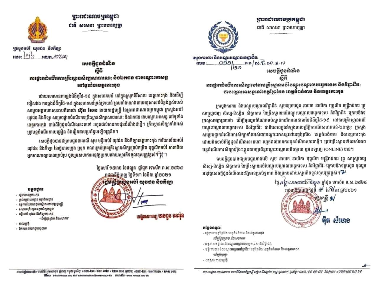 ការសម្រេចផ្អាកសកម្មភាពគ្រឹះស្ថានសិក្សារដ្ឋនិងឯកជនខាងលើ ដើម្បីចូលរួមទប់ស្កាត់និងកាត់បន្ថយការរីករាលដាលជំងឺកូវីដ-19 នៅក្នុងសហគមន៍។ គ្រឹះស្ថានសិក្សាត្រូវបន្តរៀបចំកម្មវិធីសិក្សារៀងៗខ្លួនតាមប្រព័ន្ធបណ្ដុះបណ្ដាលពីចម្ងាយ ឬអនឡាញ។ ទន្ទឹមគ្នានេះ ក្រសួងការងារ និងបណ្តុះបណ្តាលវិជ្ជាជីវៈក៏សម្រេចផ្អាកទីតាំងបណ្តុះបណ្តាលវិជ្ជាជីវៈនៅតាមបណ្តាខេត្តទាំងនោះជាបណ្តោះអាសន្នផងដែរ។