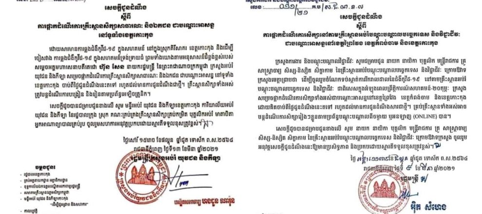 ភ្នំពេញ៖ បន្ទាប់ពីបើកដំណើរការគ្រឹះស្ថានសិក្សារដ្ឋ និងឯកជនឡើងវិញនៅទូទាំងប្រទេសបានក្នុងរយៈពេលខ្លី ពេលនេះសាលារៀនទាំងអស់រាជធានីភ្នំពេញ ខេត្តកណ្ដាល ខេត្តព្រះសីហនុ (ក្រុងព្រះសីហនុ និងស្រុកស្ទឹងហាវ) ខេត្តព្រៃវែង និងខេត្តកោះកុង បានផ្អាកសកម្មភាពបង្រៀនជាបណ្តោះអាសន្នម្តងទៀតដោយសារឥទ្ធិពលជំងឺផ្លូវដង្ហើមកូវីដ-19 បន្ទាប់ពីមានព្រឹត្តិការណ៍សហគមន៍20 កុម្ភះផ្ទុះឡើងកន្លងទៅ។