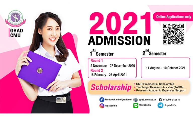 បញ្ជាក់ អាហារូបករណ៍នេះបើកទទួលពាក្យចាប់ពីថ្ងៃទី18 ខែកុម្ភៈ ដល់ថ្ងៃទី27 ខែមេសា ឆ្នាំ2021 (សម្រាប់ឆមាសទីមួយ) និងថ្ងៃទី11 ខែសីហា ដល់ថ្ងៃទី10 ខែតុលា ឆ្នាំ2021 (សម្រាប់ឆមាសទីពីរ)។ សម្រាប់សេចក្តីលម្អិត សូមចូលទៅកាន់គេហទំព័រសាកលវិទ្យាល័យឈៀងម៉ៃ http://admission.grad.cmu.ac.th/admissions/indexeng.php ។