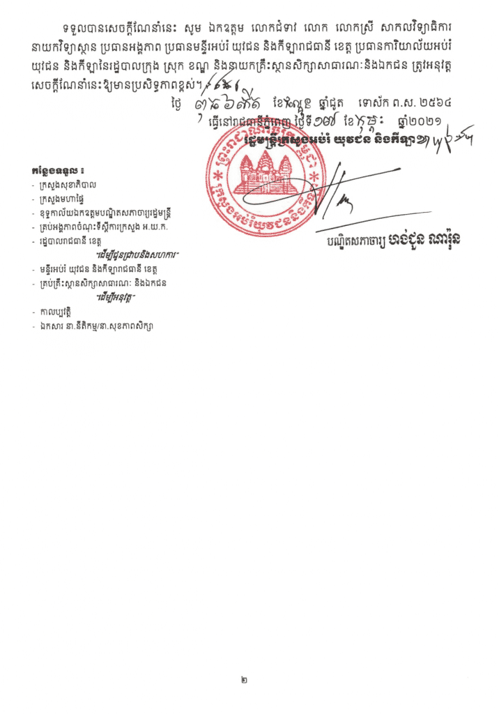 ក្រសួងអប់រំ យុវជន និងកីឡា បានណែនាំដល់គ្រប់អង្គភាពដែលពាក់ព័ន្ធទាំងអស់ត្រូវអនុវត្តតាមសេចក្ដីណែនាំនេះដោយកំណត់និងផ្សព្វផ្សាយឱ្យបានទូលំទូលាយ។ សាកលវិទ្យាធិការ នាយកវិទ្យាស្ថាន ប្រធានអង្គភាព ប្រធានមន្ទីរអប់រំ យុវជន និងកីឡា រាជធានី-ខេត្ត ប្រធានការិយាល័យអប់រំ យុវជន និងកីឡានៃរដ្ឋបាលក្រុង ស្រុក ខណ្ឌ និងនាយកគ្រឹះស្ថានសិក្សាសាធារណៈ និងឯកជន ត្រូវអនុវត្តសេចក្ដីណែនាំនេះឱ្យមានប្រសិទ្ធភាពខ្ពស់។