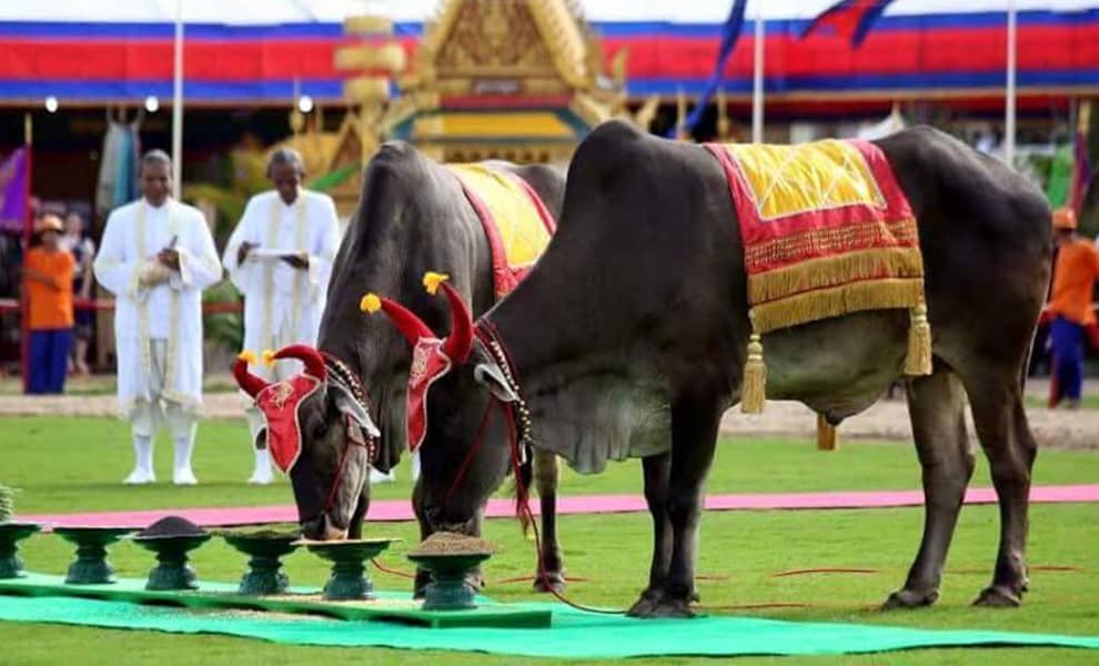 ព្រាហ្មណ៍ព្រះរាជគ្រូសូត្រចប់ យកទឹកមន្តប្រោះក្បាលព្រះគោទាំងពីរ ហើយមានមន្ត្រីម្នាក់ដឹកគោឧសភរាជទាំងពីរទៅឱ្យស៊ីផឹករបស់ទាំងប្រាំពីរយ៉ាងដែលបានរៀបចំដាក់លើតុ។អាហារទាំងប្រាំពីរនោះគោចង់ស៊ីឬផឹក គ្មាននរណាម្នាក់អាចបង្ខំបានឡើយ។ កាលព្រះគោឧសភរាជស៊ីឬផឹកអ្វីមួយតិចឬច្រើន ព្រាហ្មណ៍ក៏ទាយថាភោគផលនោះនឹងទទួលបានផលច្រើននៅឆ្នាំនោះ។ ចំណែកឯការទូស្សន៍ទាយនេះ អាចត្រូវឬមិនត្រូវមិនមែនជារឿងបញ្ហាអ្វីទេ តែអ្វីដែលសំខាន់នោះព្រះពិធីនេះជានិមិត្តរូបដ៏សំខាន់ក្នុងវិស័យកសិកម្មខ្មែរ៕