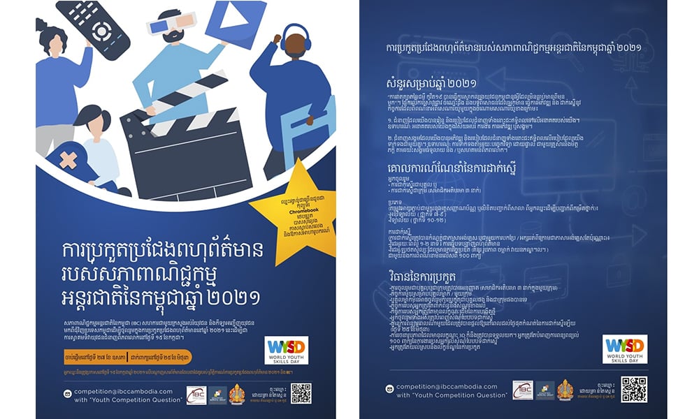 សភាពាណិជ្ជកម្មអន្តរជាតិនៃកម្ពុជា សហការជាមួយនិងក្រសួងអប់រំ យុវជន និងកីឡា អញ្ជើញយុវជនមកពីជុំរាជធានី-ខេត្តទូទាំងប្រទេសកម្ពុជាដើម្បីដាក់ពាក្យចូលរួមការប្រកួតប្រជែងពហុព័ត៌មានឆ្នាំ២០២១។ ផុតកំណត់ដាក់ពាក្យ៖ ថ្ងៃទី ២៥ ខែមិថុនា ឆ្នាំ២០២១