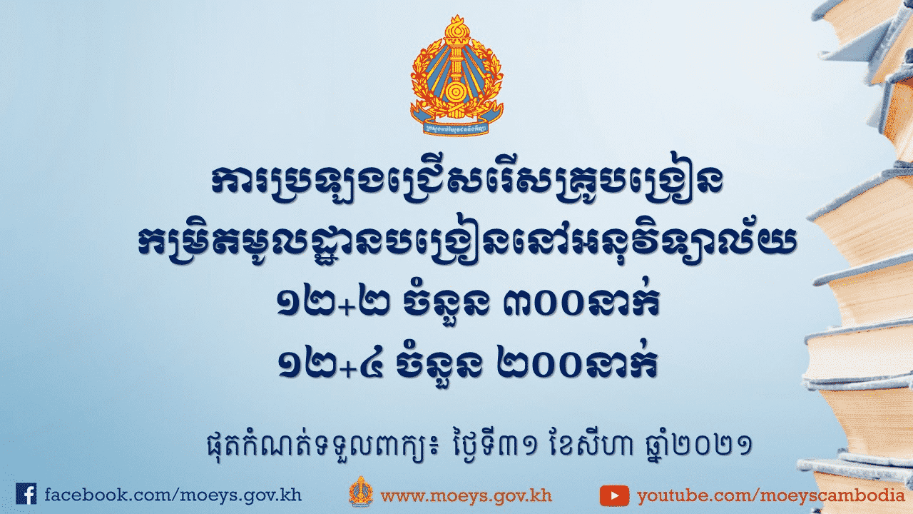 ភ្នំពេញ៖ ក្រសួងអប់រំ យុវជន និងកីឡា បានចេញសេចក្ដីប្រកាសជ្រើសរើសគ្រូបង្រៀនកម្រិតមូលដ្ឋានសរុបចំនួន ៥០០នាក់ ដើម្បីបង្រៀននៅអនុវិទ្យាល័យនានានៅកម្ពុជា។