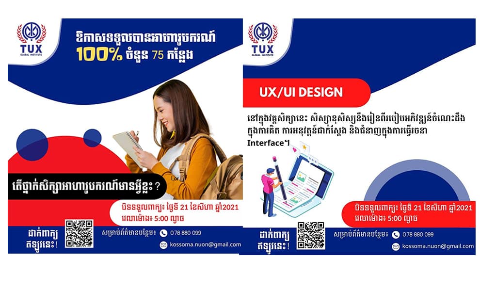 ភ្នំពេញ៖ វិទ្យាស្ថានថាក់គ្លូប៊ល (Tux Global Institute) ផ្ដល់អាហារូបករណ៍ផ្នែកបច្ចេកវិទ្យាឌីជីថលដែលមាន UX/UI Design, Digital Marketing, App/Web Design ចំនួន ៧៥កន្លែង ។ អាហារូបករណ៍នេះផ្ដល់ជូនដល់និស្សិតដែលបញ្ជប់ការសិក្សានៅថ្នាក់វិទ្យាល័យ ឬជានិស្សិតកំពុងសិក្សានៅឆ្នាំទី១ ឆ្នាំទី២ ឆ្នាំទី៣ នៅតាមសាកលវិទ្យាល័យ ឬវិទ្យាស្ថានណាមួយ ។