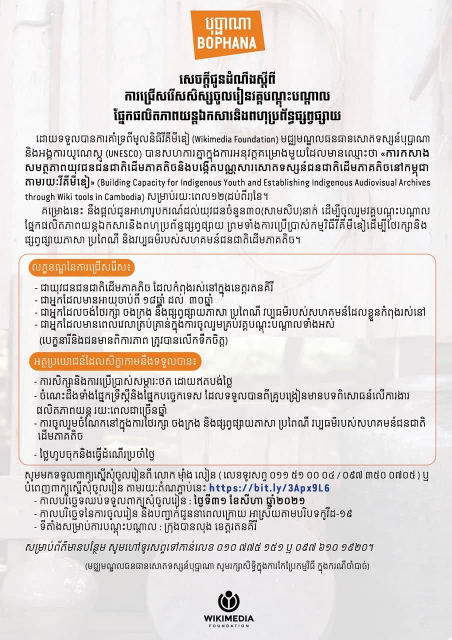 ភ្នំពេញ៖ មជ្ឈមណ្ឌលធនធានសោតទស្សន៍បុប្ផាណាប្រកាសជ្រើសរើសសិស្សចំនួន៣០នាក់ទៅសិក្សាក្នុងវគ្គបណ្ដុះបណ្ដាលផ្នែកផលិតភាពយន្តឯកសារ និងពហុប្រព័ន្ធផ្សព្វផ្សាយ។ បន្ថែមពីការរៀនវគ្គបណ្ដុះបណ្ដាលផ្នែកផលិតភាពយន្តឯកសារ និងពហុប្រព័ន្ធផ្សព្វផ្សាយសិស្សក៏ទទួលបានការប្រើប្រាស់កម្មវិធីវីគីមីឌៀដើម្បីថែរក្សា និងផ្សព្វផ្សាយភាសាប្រពៃណី និងវប្បធម៌របស់សហគមន៍ជនជាតិភាគតិចផងដែរ។