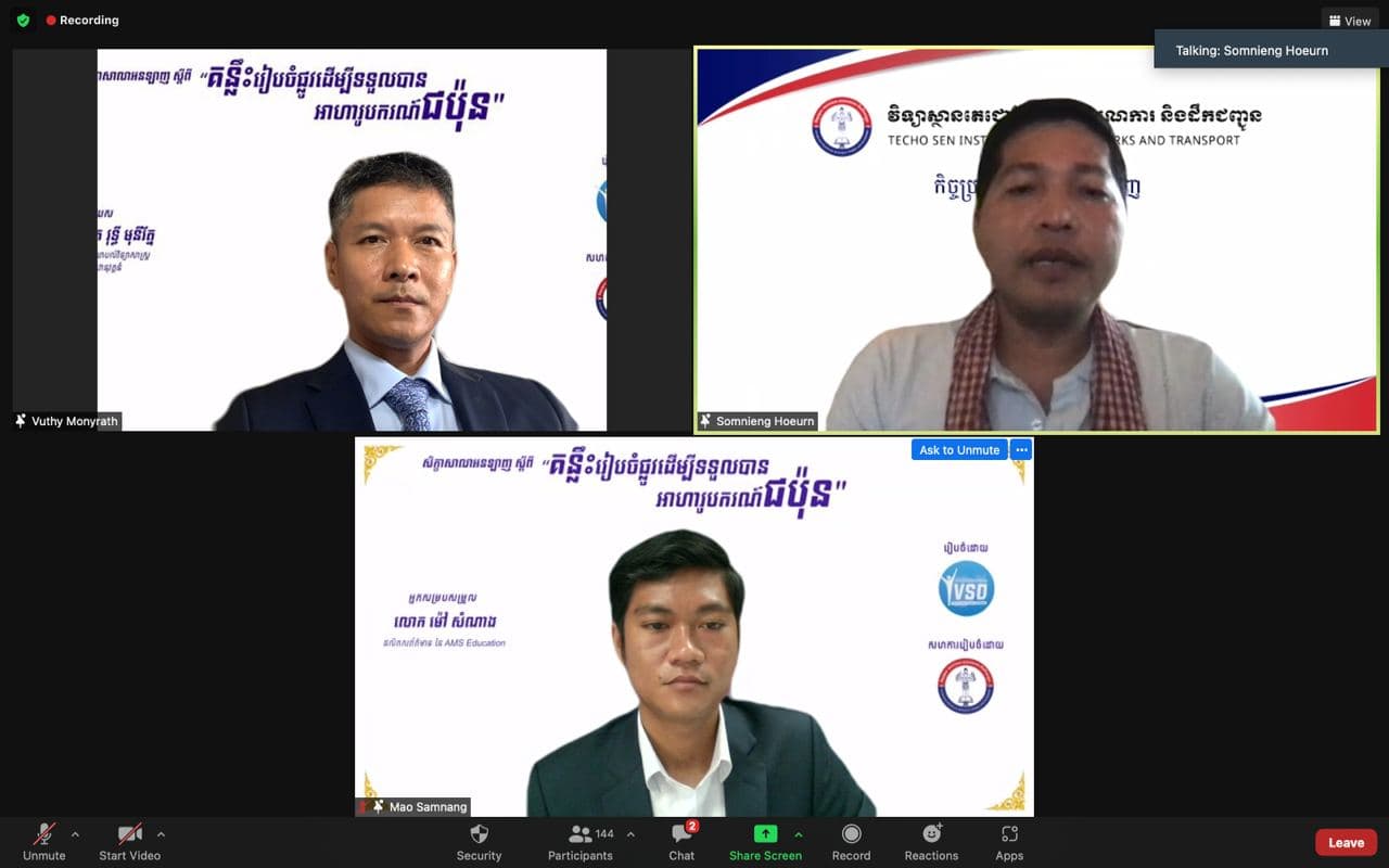 សូមជម្រាបថា សិក្ខាសាលាអនឡាញក្រោមប្រធានបទ “គន្លឹះរៀបចំផ្លូវដើម្បីទទួលបានអាហារូបករណ៍ជប៉ុន” រៀបចំឡើងក្នុងគោលបំណងស្វែងយល់បន្ថែមអំពីអាហារូបករណ៍ និងការសិក្សានៅប្រទេសជប៉ុន និងស្វែងយល់ពីគន្លឹះ និងបទពិសោធន៍នៃការត្រៀមខ្លួនក្នុងការបំពេញបែបបទឲ្យមានភាពទាក់ទាញ និងត្រៀមសម្ភាសន៍ឲ្យបានពិន្ទុខ្ពស់ ។ សិក្ខាសាលាអនឡាញនេះ រៀបចំឡើងដោយក្រុមយុវជនស្ម័គ្រចិត្តដើម្បីការអភិវឌ្ឍសង្គម – YVSD សហការដោយវិទ្យាស្ថានតេជោសែន សាធារណការ និងដឹកជញ្ជូន ៕
