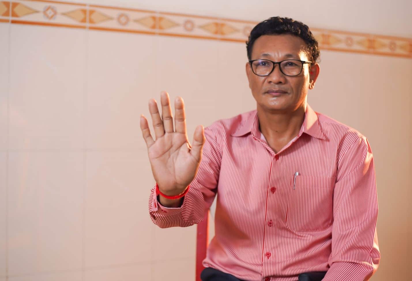 Speaking and gesturing to explain his intention to educate his children, Mr. Un Saravuth believes there is only one non-violent method of educating his children that helps his children to study well and always get good grades.