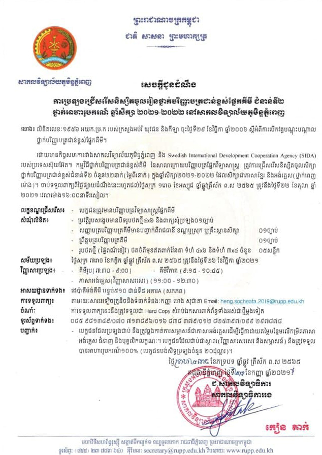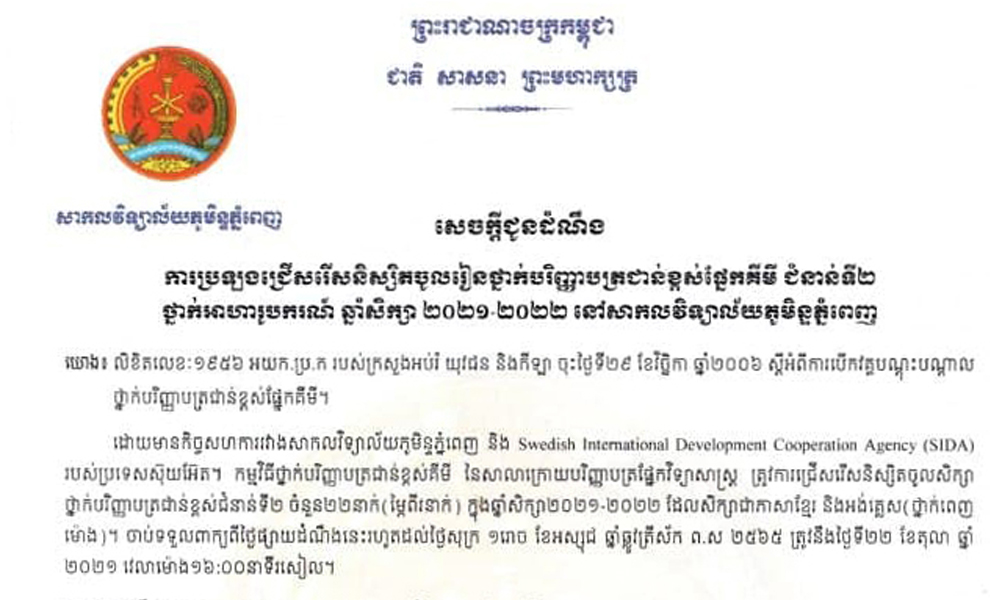 ភ្នំពេញ- ដោយមានកិច្ចសហការរវាងសាកលវិទ្យាល័យភូមិន្ទភ្នំពេញ និង SIDA របស់ប្រទេសស៊ុយអ៊ែត សាកលវិទ្យាល័យភូមិន្ទភ្នំពេញបានប្រកាសជ្រើសរើសនិស្សិតអាហារូបករណ៍ថ្នាក់បររិញ្ញាបត្រជាន់ខ្ពស់ផ្នែកគីមី ជំនាន់ទី២ ឆ្នាំសិក្សា២០២១-២០២២ ចំនួន២២កន្លែង។