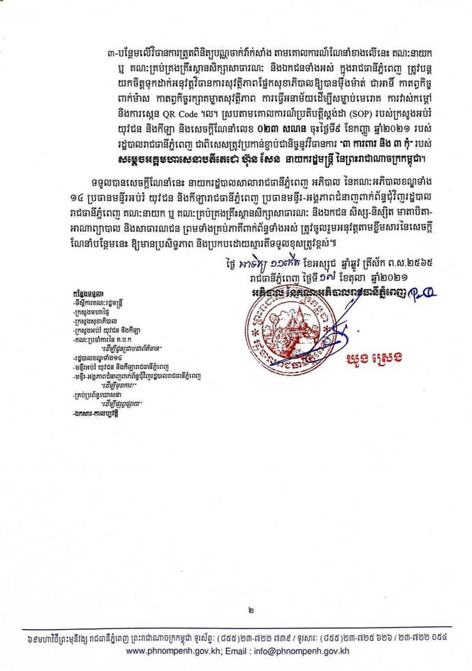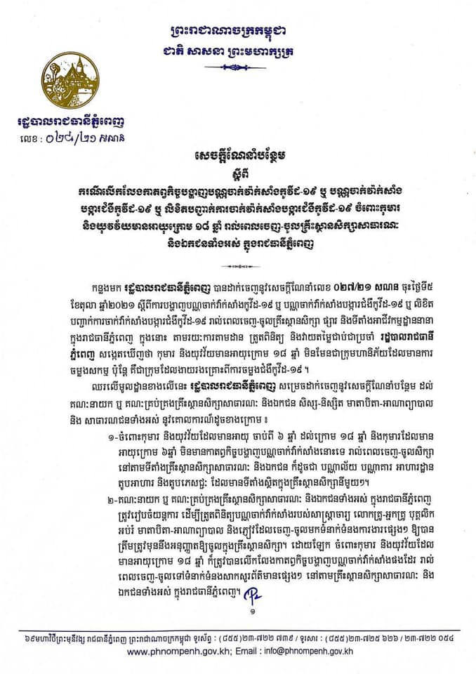 ភ្នំពេញ – រដ្ឋបាលរាជធានីភ្នំពេញ កាលពីថ្ងៃអាទិត្យ (១៧ តុលា) បានចេញសេចក្តីសម្រេចថ្មីមួយ ដោយលើកលែងកាតព្វកិច្ច បង្ហាញបណ្ណចាក់វ៉ាក់សាំង ចំពោះកុមារ និងយុវវ័យអាយុក្រោម១៨ឆ្នាំ រាល់ពេលចេញចូលសាលារៀន។