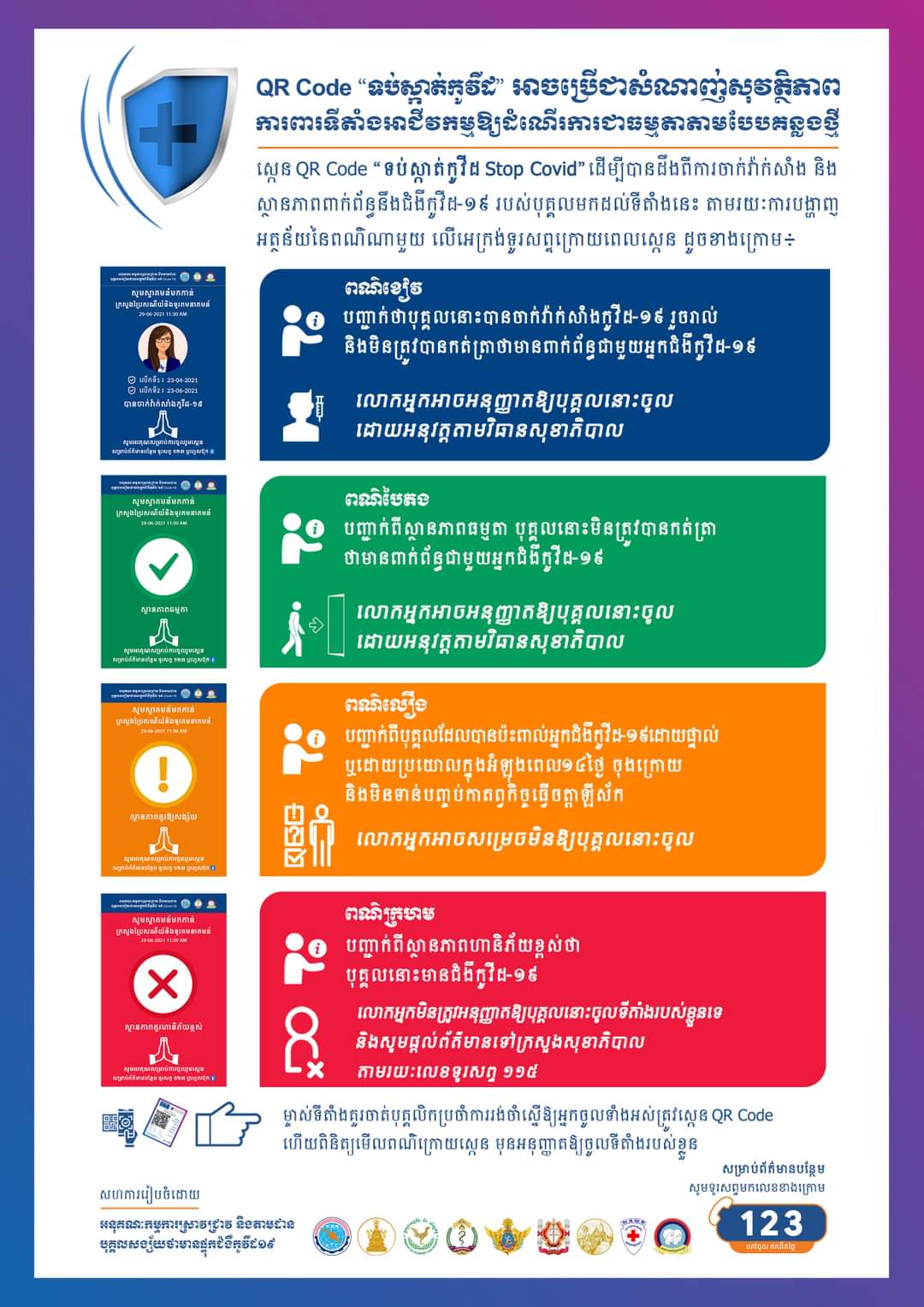 ជាមួយគ្នានេះ ក្រសួងប្រៃសណីយ៍ និងទូរគមនាគមន៍ ក៏បានណែនាំដល់ម្ចាស់ទីតាំងដែលមិនទាន់បានប្រើប្រាស់ប្រព័ន្ធ QR Code នេះ សូមរួសរាន់បង្កើត QR Code សម្រាប់ទីតាំងរបស់ខ្លួនតាមរយៈគេហទំព័រ stopcovid.gov.kh ។ ហើយម្ចាស់ទីតាំងត្រូវតម្រូវឱ្យបុគ្គលដែលចេញ-ចូលទីតាំងរបស់ខ្លួន ស្កេន QR Code ដើម្បីបានដឹងពីស្ថានភាពពាក់ព័ន្ធនឹងជំងឺកូវីដ-១៩ របស់បុគ្គលទាំងនោះ តាមរយៈការបង្ហាញពណ៌លើអេក្រង់ទូរសព្ទក្រោយពេលស្កេន ។