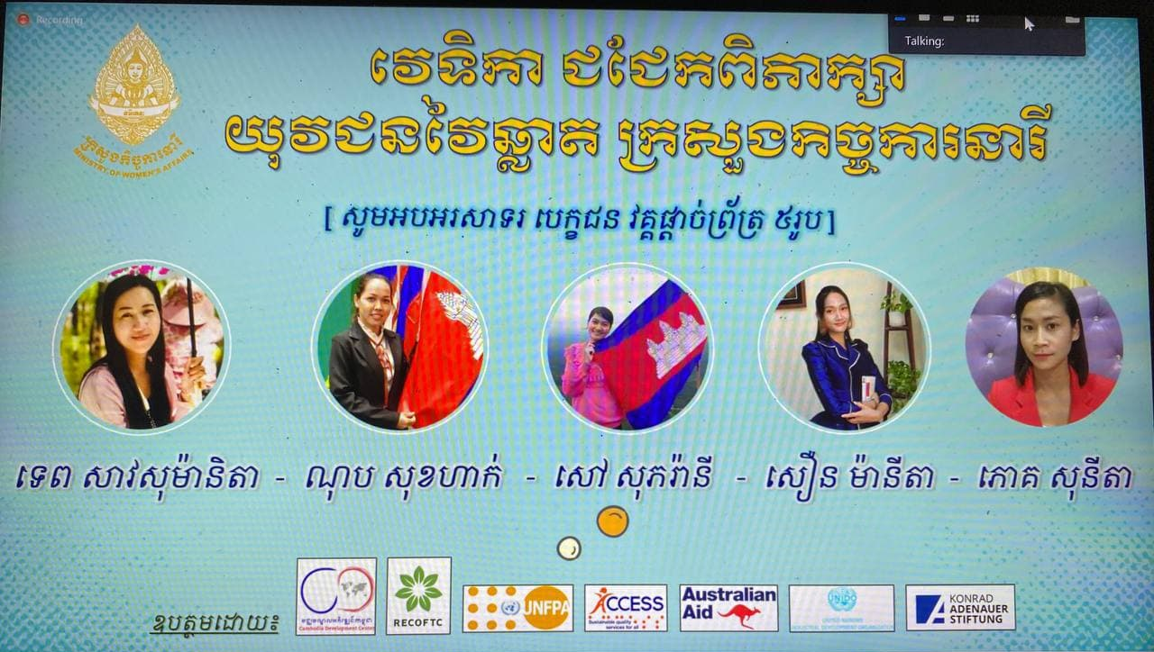 វេទិកាជជែកពិភាក្សានេះដឹកនាំសម្របសម្រួលដោយលោកជំទាវ ហ៊ូ និរមិត្តា អនុរដ្ឋលេខាធិការក្រសួងកិច្ចការនារី គណៈកម្មការដាក់ពិន្ទុ ៥នាក់ ក្រុមការងារសម្របសម្រួលកម្មវីធីអភិវឌ្ឍន៍សមត្ថភាព និងអ្នកចូលរួមជាមន្រ្តីវ័យក្មេងមកពីក្រសួងកិច្ចការនារី អគ្គលេខាធិការដ្ឋានអចិន្រ្តៃយ៍ក្រុមប្រឹក្សាជាតិកម្ពុជាដើម្បីស្រ្តី និងមន្ទីរកិច្ចការនារីដោយទទួលបានការគាំទ្រថវិកាពីអង្គការ RECOFTC, Konrad-Adenauer-Stiftung (KAS), UNIDO, UNFPA និងកម្មវិធី ACCESS ៕