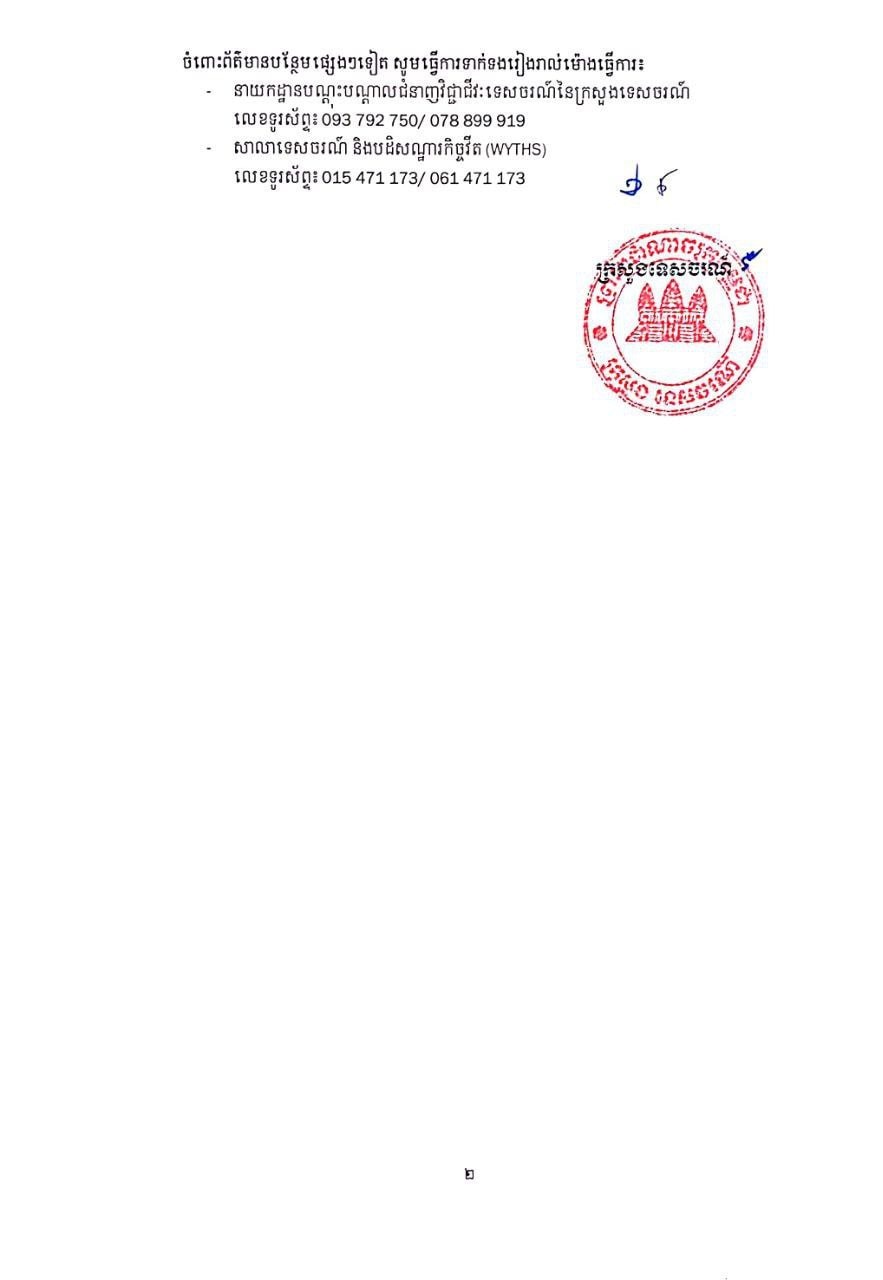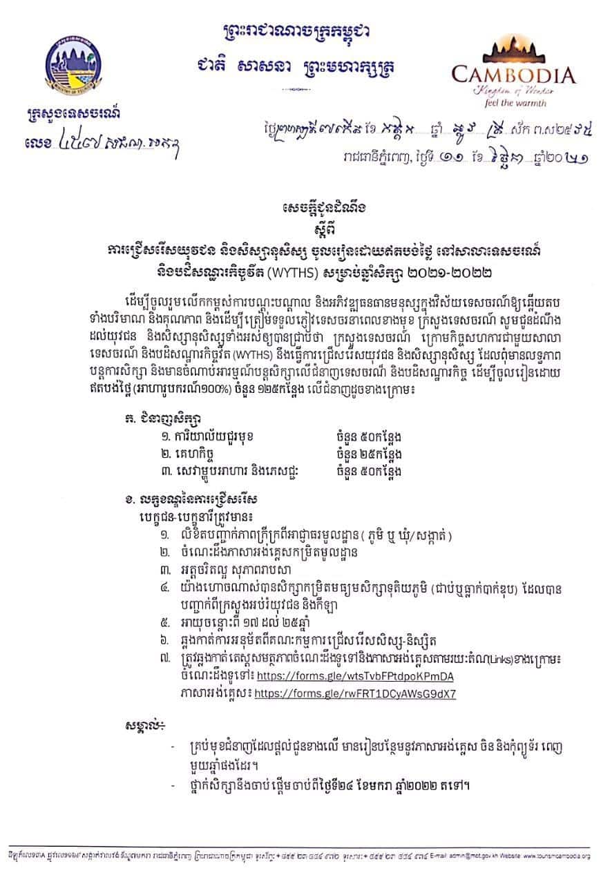 សម្រាប់ព័ត៌មានបន្ថែមសូមធ្វើការទំនាក់ទំនងទៅកាន់នាយកដ្ឋានបណ្ដុះបណ្ដាលវិជ្ជាជីវៈទេសចរណ៍នៃក្រសួងទេសចរណ៍៖ ០៩៣ ៧៩២ ៧៥០/ ០៧៨ ៨៩៩ ៩១៩ ឬទាក់ទងទៅកាន់សាលាទេសរណ៍ និងបដិសណ្ឋារកិច្ចវីត(WYTHS) ០១៥ ៤៧១ ១៧៣/ ០៦១ ៤៧១ ១៧៣ ៕