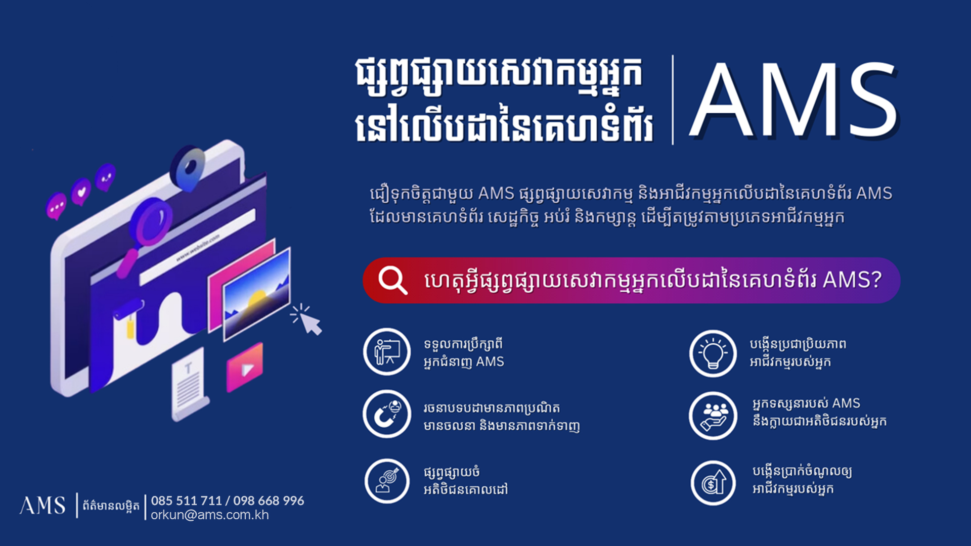 Apsara Media Services ឬ AMS មានសេវាកម្មផ្សព្វផ្សាយលើបដាក្នុងគេហទំព័ររបស់យើង។ ពេលប្រើប្រាស់សេវាកម្មរបស់ AMS លោកអ្នកនឹងទទួលបានការប្រឹក្សាពីអ្នកជំនាញ AMS ទទួលបានការរចនាបដាដែលមានភាពប្រណិត ចលនារស់រវើក ការផ្សព្វផ្សាយចំអតិថិជនគោលដៅ អ្នកទស្សនារបស់ AMS នឹងក្លាយជាអតិថិជនរបស់អ្នក និងចុងក្រោយបង្កើនប្រាក់ចំណូលរបស់លោកអ្នក។