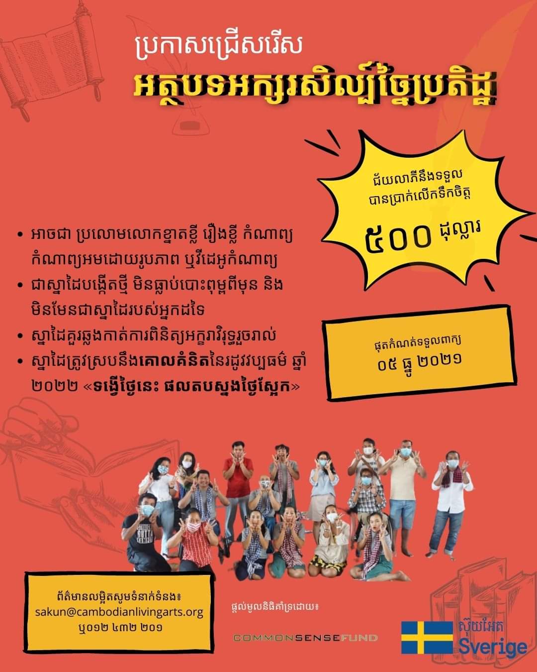 បេក្ខជនដែលចាប់អារម្មណ៍ដាក់ស្នាដៃអាចទាញយកទម្រង់ពាក្យស្នើសុំតាមរយៈតំណភ្ជាប់ https://www.cambodianlivingarts.org/…/information_-for-crea… និងផ្ញើពាក្យស្នើសុំតាមរយៈអ៊ីមែល sakun@cambodianlivingarts.org ។
