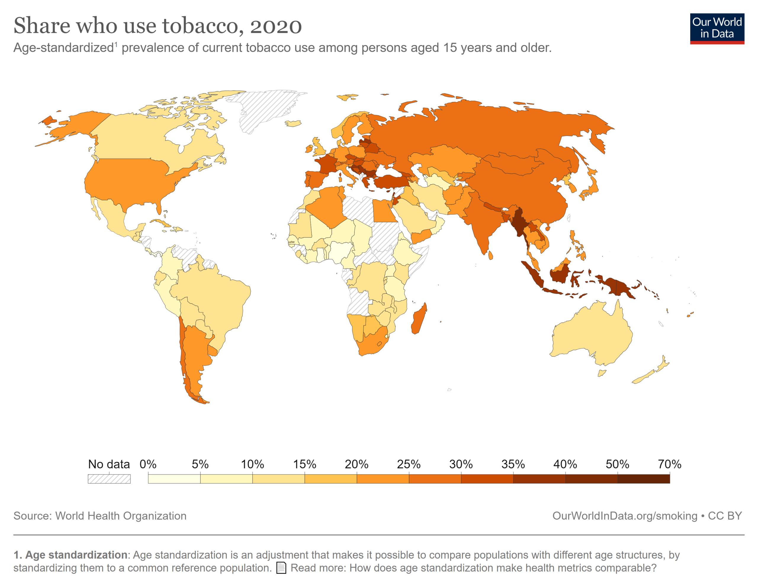 ការជក់បារីមិនត្រឹមតែជាប្រភពនៃក្ដីកង្វល់សម្រាប់រដ្ឋាភិបាលរបស់ប្រទេសអភិវឌ្ឍន៍ប៉ុណ្ណោះទេ។ យោងតាមរបាយការណ៍អង្គការសុខភាពពិភពលោក (WHO) បានបង្ហាញថា អ្នកប្រើប្រាស់ថ្នាំជក់ជាង ៨០ភាគរយ រស់នៅក្នុងប្រទេស ដែលមានចំណូលទាប និងមធ្យម។