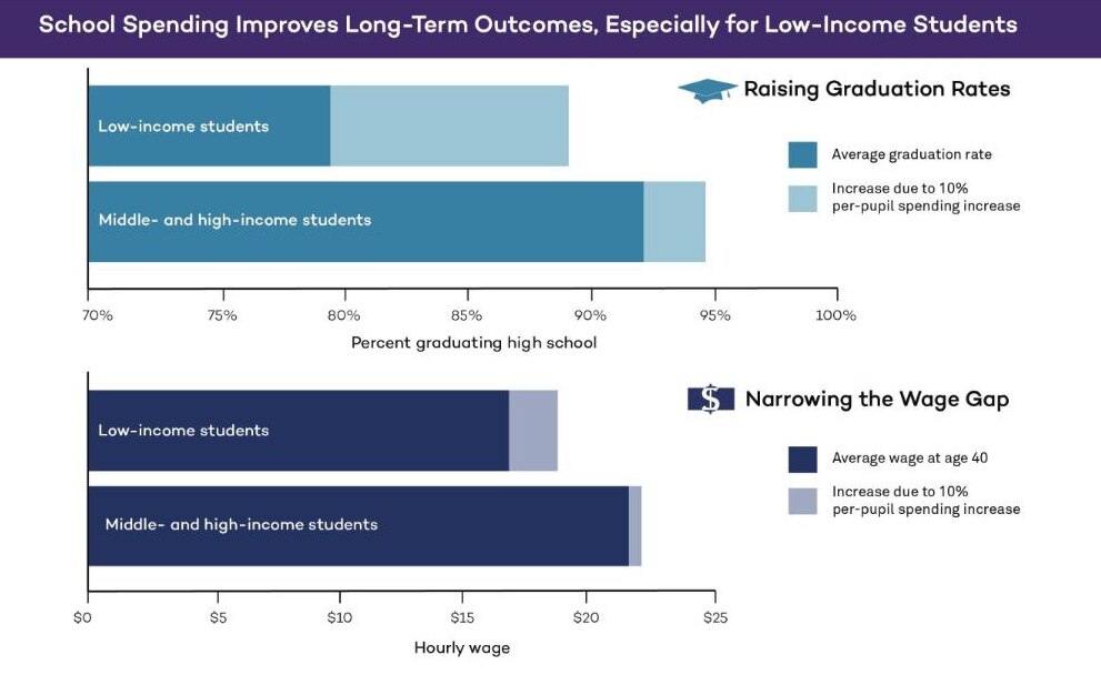ឯកសារពីវិទ្យាស្ថានស្រាវជ្រាវគោលនយោបាយ ដែលជាមជ្ឈមណ្ឌលស្រាវជ្រាវគោលនយោបាយសាធារណៈនៅសាកលវិទ្យាល័យ Northwestern ក្នុងរដ្ឋ Illinois សហរដ្ឋអាមេរិក បានរកឃើញថា ការកើនឡើង ១០ភាគរយ នៃការចំណាយក្នុងរយៈពេល ១២ ឆ្នាំនៅសាលារដ្ឋនាំឱ្យអត្រាបញ្ចប់ការសិក្សាកើនឡើង ៧ភាគរយ។ លើសពីនេះ និស្សិតបញ្ចប់ការសិក្សាបានកើនឡើង ១៣ភាគរយបន្ថែមទៀត។