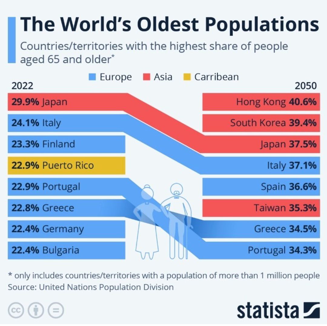 នៅឆ្នាំ២០៥០ ចំនួនប្រជាជននៃទីក្រុងហុងកុង កូរ៉េខាងត្បូង និងជប៉ុន ដែលមានអាយុចាប់ពី៦៥ នឹងមានរហូតទៅដល់ប្រហែល ៤០ភាគរយនៃប្រជាជនសរុប ដែលទិន្នន័យនេះមានភាពខុសគ្នាខ្លាំង បើធៀបទៅនឹងទិន្នន័យក្នុងពេលបច្ចុប្បន្ន។ នាយកដ្ឋានអង្គការសហប្រជាជាតិទទួលបន្ទុកកិច្ចការសេដ្ឋកិច្ច និងសង្គម បានសរសេរក្នុងរបាយការណ៍សង្គមពិភពលោកឆ្នាំ២០២៣ ថា «ភាពចាស់នៃចំនួនប្រជាជន គឺជានិន្នាការសកលនៃពិភពលោកសម័យទំនើប»។ យើងអាចចាត់ទុករឿងនេះ ជាភាពជោគជ័យដ៏សំខាន់មួយក្នុងការថែទាំសុខភាពរបស់មនុស្សជាតិ ប៉ុន្តែលទ្ធផលនេះគឺនាំមកនូវទាំងបញ្ហាប្រឈម និងឱកាស។