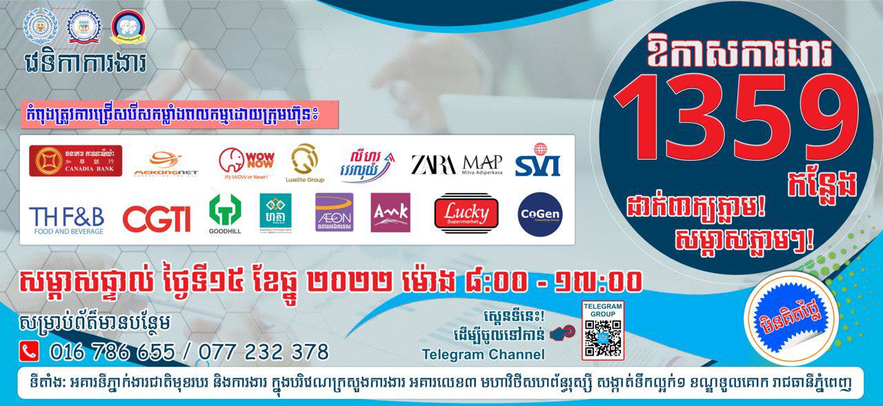 ភ្នំពេញ – ទីភ្នាក់ងារជាតិមុខរបរ និងការងារ សហការជាមួយ ស.ស.យ.ក. វិស័យការងារនិងបណ្តុះបណ្តាលវិជ្ជាជីវៈ នឹងរៀបចំវេទិកាការងារប្រចាំខែ ដោយមានក្រុមហ៊ុនធំៗចំនួន១៦ចូលរួម និងនាំយកនូវឱកាសការងារចំនួន ១៣៥៩ កន្លែង។ វេទិកាការងារប្រចាំខែនេះគ្រោងនឹងធ្វើឡើងនៅថ្ងៃទី១៥ ខែធ្នូ ឆ្នាំ២០២២ ខាងមុខនេះ ចាប់ពីម៉ោង ៨:០០ព្រឹក ដល់ម៉ោង ៥:០០ល្ងាច នៅក្នុងបរិវេណក្រសួងការងារ និងបណ្តុះបណ្តាលវិជ្ជាជីវៈ។