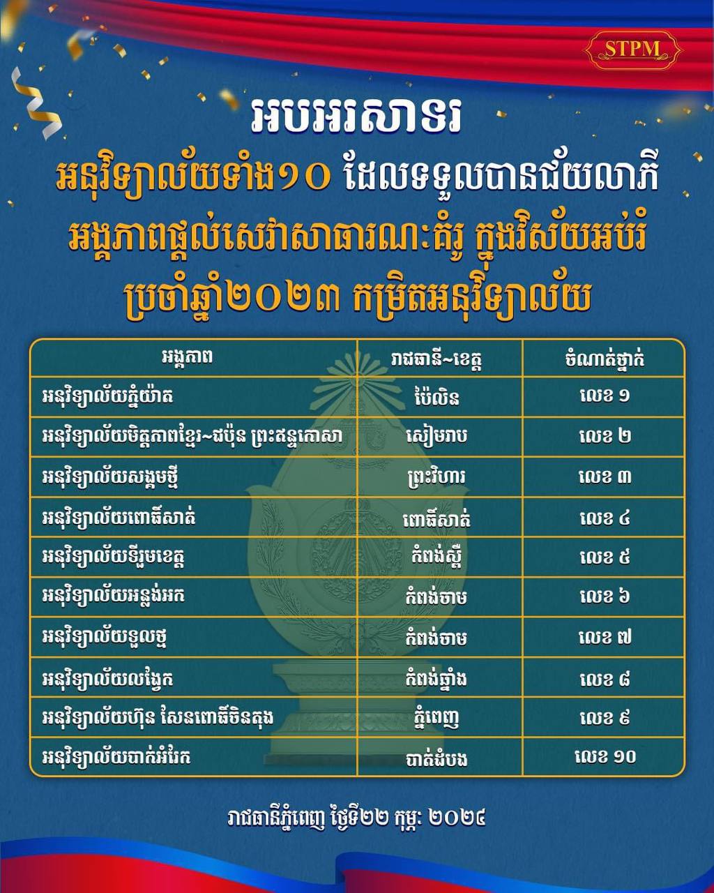 សូមគោរពជម្រាបជូនផងដែរថា គណៈកម្មការវាយតម្លៃអង្គភាពផ្តល់សេវាសាធារណៈថ្នាក់ជាតិ បានបន្តនិរន្តរភាពការងារ និងជំរុញការអនុវត្តការវាយតម្លៃ និងការទទួលស្គាល់អង្គភាពផ្តល់សេវាសាធារណៈគំរូ ក្នុងវិស័យអប់រំ (ឆ្នាំ២០២២ និង២០២៣) ដែលមានបេក្ខភាពសរុបក្នុងវិស័យអប់រំកម្រិតអនុវិទ្យាល័យចំនួន៤២ មកពី២២ រាជធានីខេត្ត កម្រិតសាលាបឋមសិក្សាចំនួន៤៦ មកពី២៤ រាជធានី ខេត្ត៕
