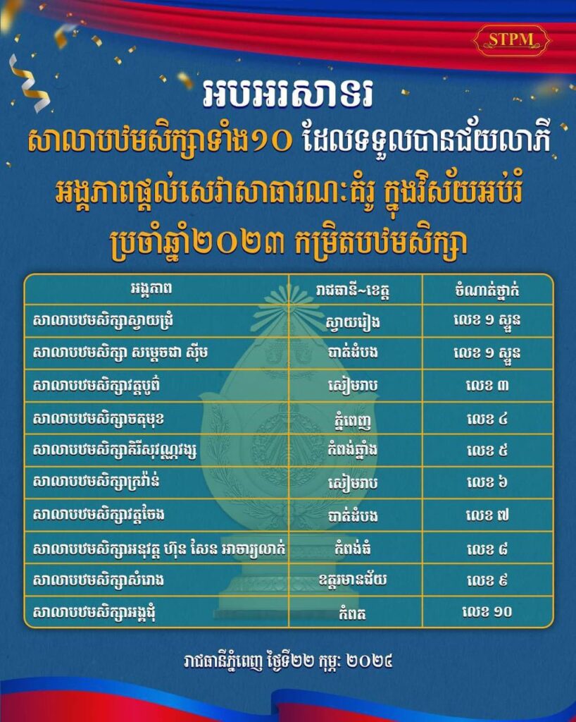 សាលារៀនចំនួន៣ ដែលស្ថិត នៅ ខេត្តប៉ៃលិន ស្វាយរៀង និងខេត្តបាត់ដំបង បានជាប់ជ័យលាភី លេខ១ ជាអង្គភាព ផ្តល់សេវាសាធារណៈគំរូក្នុងវិស័យអប់រំ សម្រាប់ឆ្នាំ ២០២៣។
