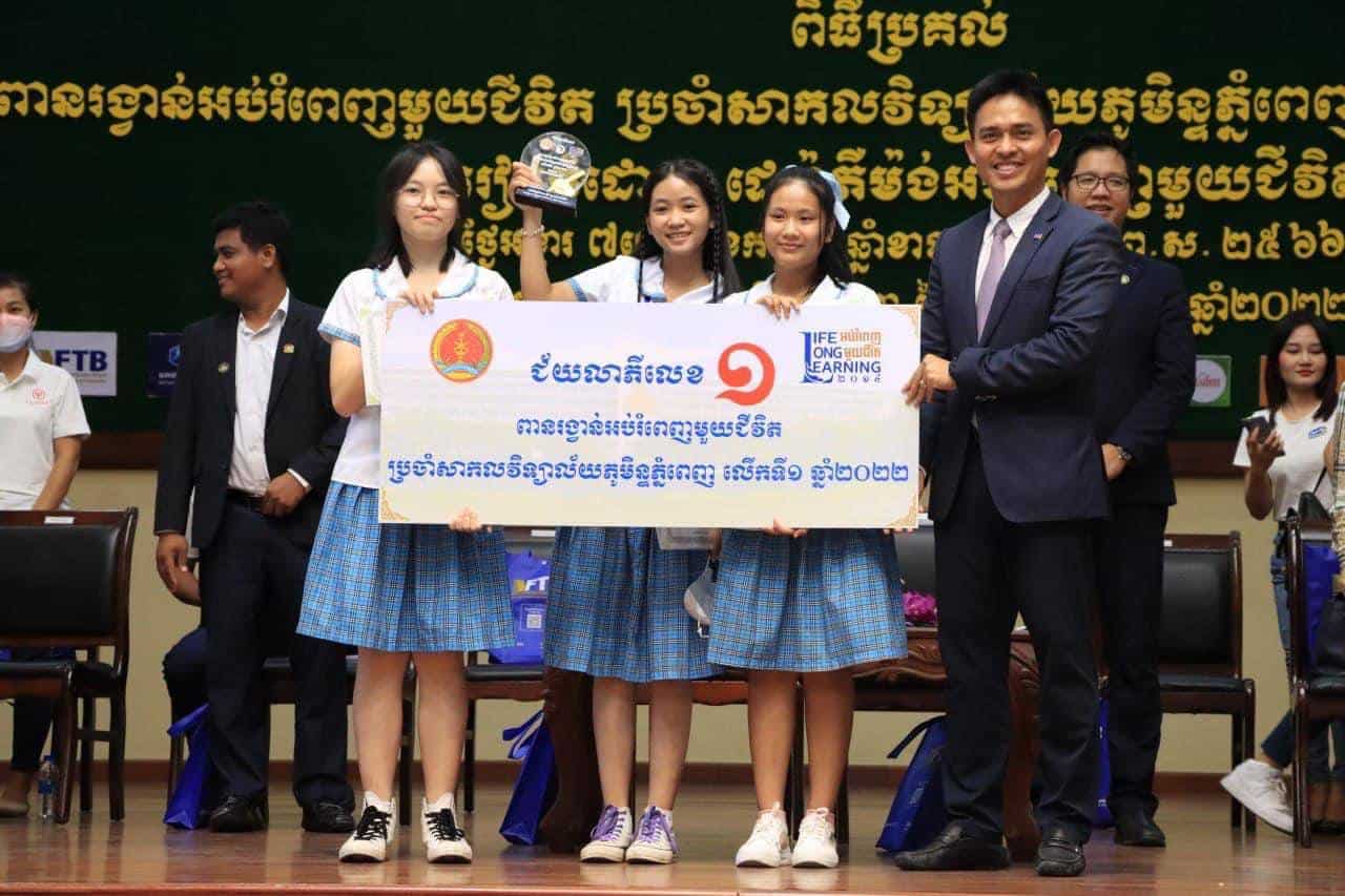 ភ្នំពេញ – សិស្សឆ្នើមចំនួន៥ក្រុម បានឈ្នះជ័យលាភីក្នុងការប្រកួតសំណេរ ពានរង្វាន់អប់រំពេញមួយជីវិត លើកទី១ ក្រោមប្រធានបទ « ការសិក្សាពេញមួយជីវិតបានដើរតួនាទីយ៉ាងសំខាន់ក្នុងការផលិតធនធានមនុស្សប្រកបដោយសមត្ថភាពក្នុងការជំរុញឱ្យប្រទេសកម្ពុជាក្លាយជាប្រទេសមានចំណូលមធ្យមកម្រិតខ្ពស់នាឆ្នាំ ២០៣០ និងជាប្រទេសមានចំណូលខ្ពស់នៅឆ្នាំ ២០៥០» ដែលរៀបចំឡើងដោយសាកលវិទ្យាល័យភូមិន្ទភ្នំពេញ។