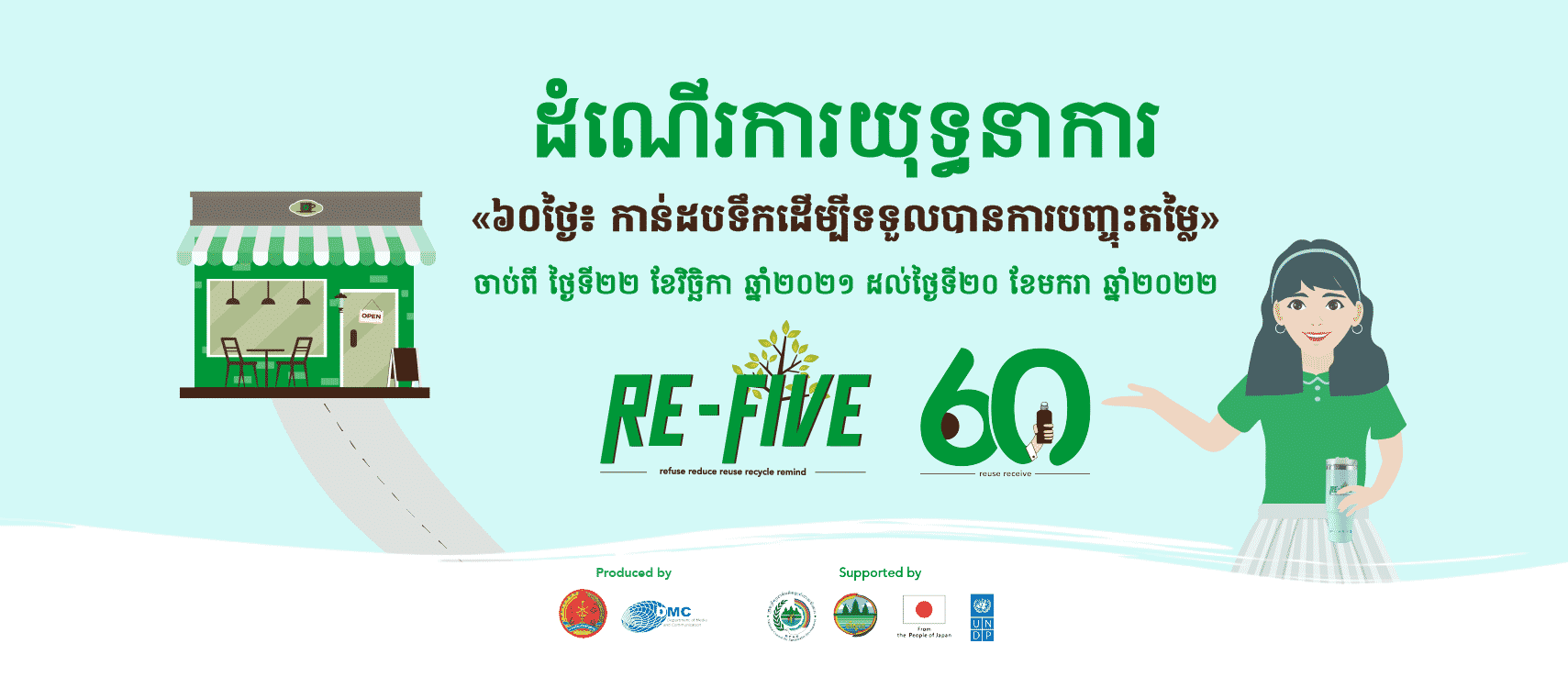 ភ្នំពេញ – ក្រុមនិស្សិតគម្រោង Re-Five បានប្រកាសអំពីយុទ្ធនាការ «៦០ ថ្ងៃ៖ កាន់ដបទឹកដើម្បីទទួលបានការបញ្ចុះតម្លៃ» ដែលនឹងប្រព្រឹត្តទៅចាប់ពីថ្ងៃទី២២ ខែវិច្ឆិកា ឆ្នាំ២០២១ រហូតដល់ថ្ងៃទី២០ ខែមករា ឆ្នាំ២០២២ ដើម្បីចូលរួមលើកកម្ពស់ការកាត់បន្ថយការប្រើប្រាស់ប្លាស្ទិកនៅកម្ពុជា ដោយលោកអ្នកនឹងទទួលបានការបញ្ជុះតម្លៃពី ១០% រហូតដល់ ៥០% ពីហាងដែលជាដៃគូរក្នុងយុទ្ធនាការនេះ គ្រាន់តែយកដបទឹកផ្ទាល់ខ្លួនមកទិញភេសជ្ជៈជំនួសឱ្យការប្រើប្រាស់កែវ និងថង់ប្លាស្ទិក។