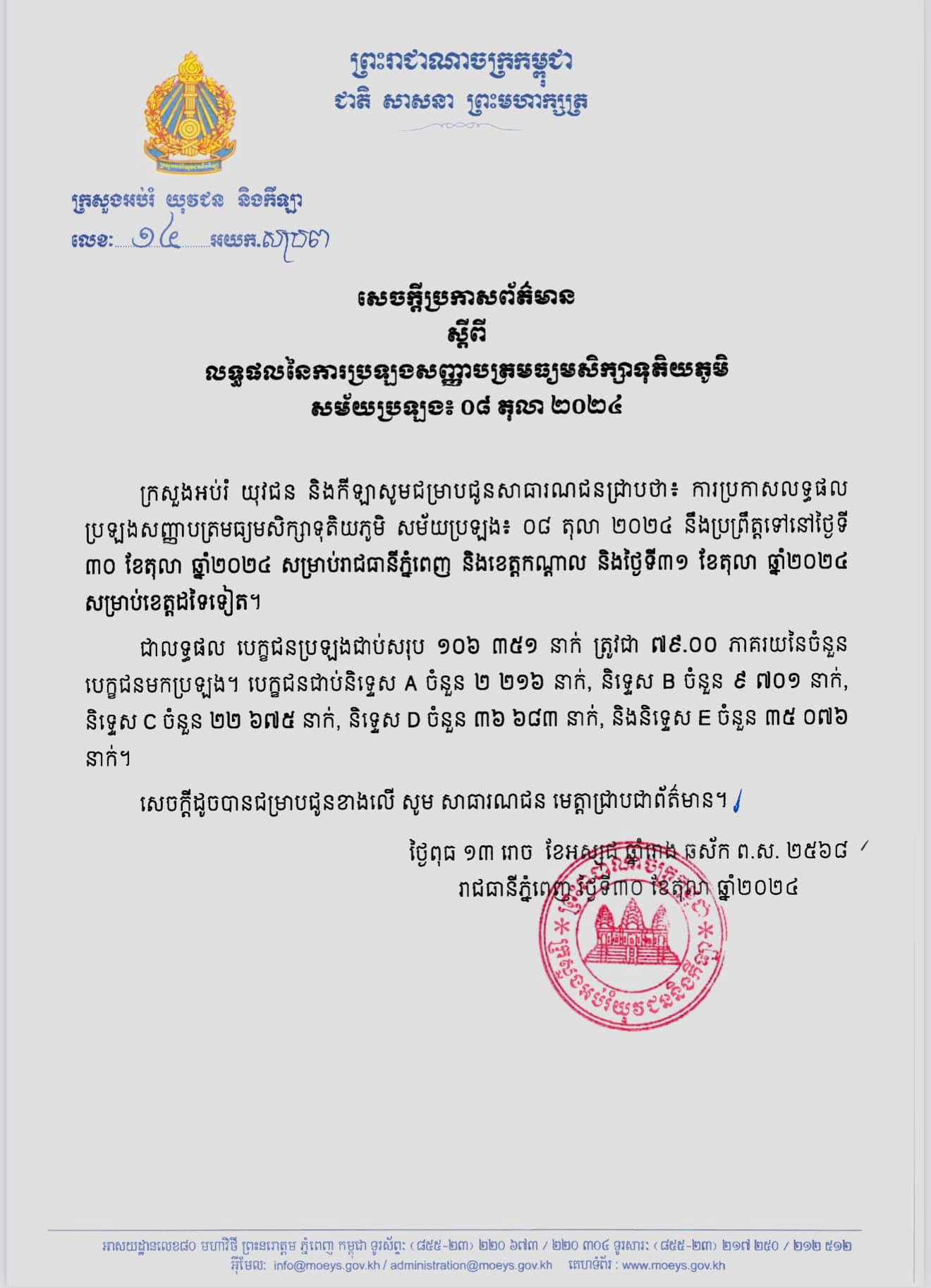 យោង​តាម​លទ្ធផល នៃការ​ប្រឡង​សញ្ញាបត្រមធ្យមសិក្សា​ទុតិយភូមិ សម័យ​ប្រឡង ៨ តុលា ២០២៤ បានបង្ហាញថា បេក្ខជន​សរុប​ចំនួន ១០៦ ៣៥១នាក់ ត្រូវ​ជា ៧៩ភាគរយ នៃ​ចំនួន​បេក្ខជន​មកប្រឡង​ បានជាប់សញ្ញាបត្រ​មធ្យមសិក្សា​ទុតិយភូមិ ឬបាក់ឌុប ក្នុងឆ្នាំសិក្សា​២០២៣-២០២៤នេះ។