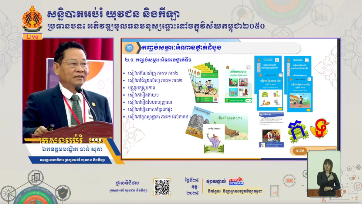 ក្នុងសន្និបាតបូកសរុបការងារអប់រំ យុវជន និងកីឡាឆ្នាំសិក្សា ២០២៣-២០២៤ និងលើកទិសដៅការងារឆ្នាំសិក្សា ២០២៤-២០២៥ នាព្រឹកថ្ងៃទី២៥ ខែកុម្ភៈ ឆ្នាំ២០២៥ ឯកឧត្តម ចាន់ សុភា អនុរដ្ឋលេខាធិការក្រសួងអប់រំ យុវជន និងកីឡា លើកឡើងថា មកដល់ពេលនេះ សិស្សប្រមាណ ៨៧% ស្ថិតក្នុងសាលាគោលដៅដែលកំពុងអនុវត្តកញ្ចប់សម្ភារៈអំណានថ្នាក់ដំបូង។