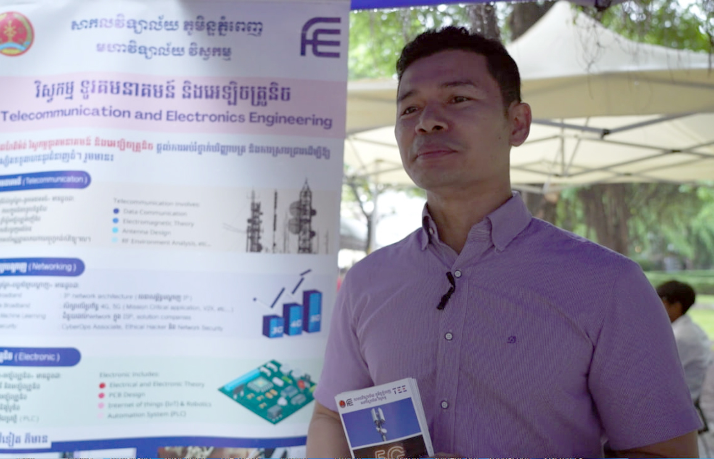 លោក គួង សំណាង ប្រធានដេប៉ាតឺម៉ង់ វិស្វកម្ម ទូរគមនាគមន៍ និងអេឡិចត្រូនិច នៃមហាវិទ្យាល័យវិស្វកម្ម សាកលវិទ្យាល័យភូមិន្ទភ្នំពេញ ដែល​កំពុង​អង្គុយពន្យល់សិស្សានុសិស្សអំពីការជ្រើសរើសជំនាញសិក្សា និងផ្ដល់ព័ត៌មានដល់សិស្ស មើលឃើញថា សិស្សានុសិស្សបាន​មកទិញពាក្យប្រឡងចូលរៀន​នៅ​សាកលវិទ្យាល័យភូមិន្ទភ្នំពេញមានចំនួនច្រើន បើទោះមានភ្លៀងធ្លាក់ ក៏នៅតែឃើញមានសិស្សតស៊ូមកទិញពាក្យប្រឡងចូលរៀន ព្រោះពួកគេគិតថាការសិក្សាមានសារៈសំខាន់។