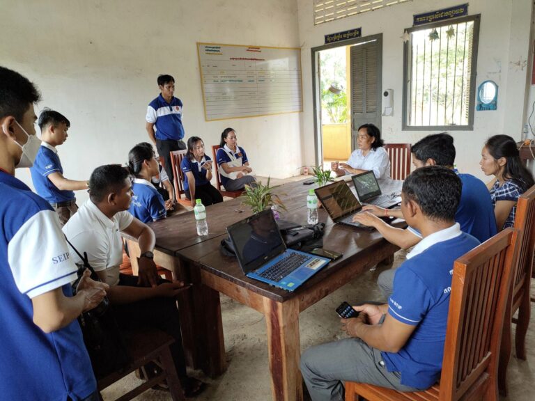 អ្នកគ្រូ ប៉ែន សុគន្ធារី កំពុងប្រជុំជាមួយនិស្សិតកម្មសិក្សា។