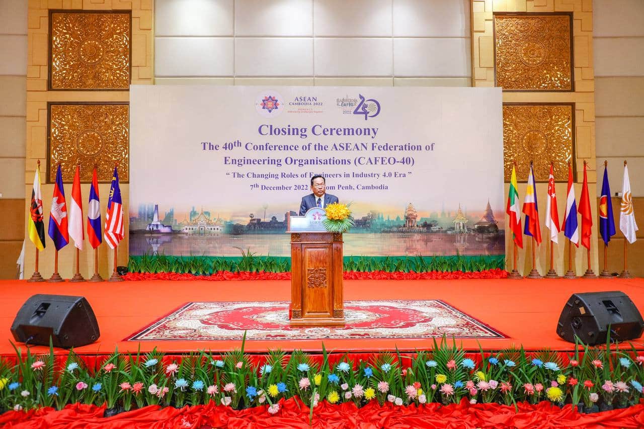 ភ្នំពេញ – ក្នុងពិធីបិទសន្និសីទនៃអង្គការសហព័ន្ធវិស្វកម្មអាស៊ានលើកទី៤០ ឯកឧត្តម អ៊ិត សំហេង រដ្ឋមន្រ្តីក្រសួងការងារ និងបណ្តុះបណ្តាលវិជ្ជាជីវៈ និងជាប្រធានក្រុមប្រឹក្សាគណៈវិស្វករកម្ពុជា បានលើកទឹកចិត្តដល់ស្ថាប័នវិស្វកម្ម នៃបណ្តាប្រទេសសមាជិកអាស៊ាននីមួយៗ បង្កើនល្បឿនកិច្ចសហប្រតិបត្តិការក្នុងក្របខណ្ឌអាស៊ានត្រិះរិះរកដំណោះស្រាយនូវរាល់បញ្ហាប្រឈមដែលកើតចេញពីការវិវឌ្ឍឧស្សាហកម្ម៤.០។
