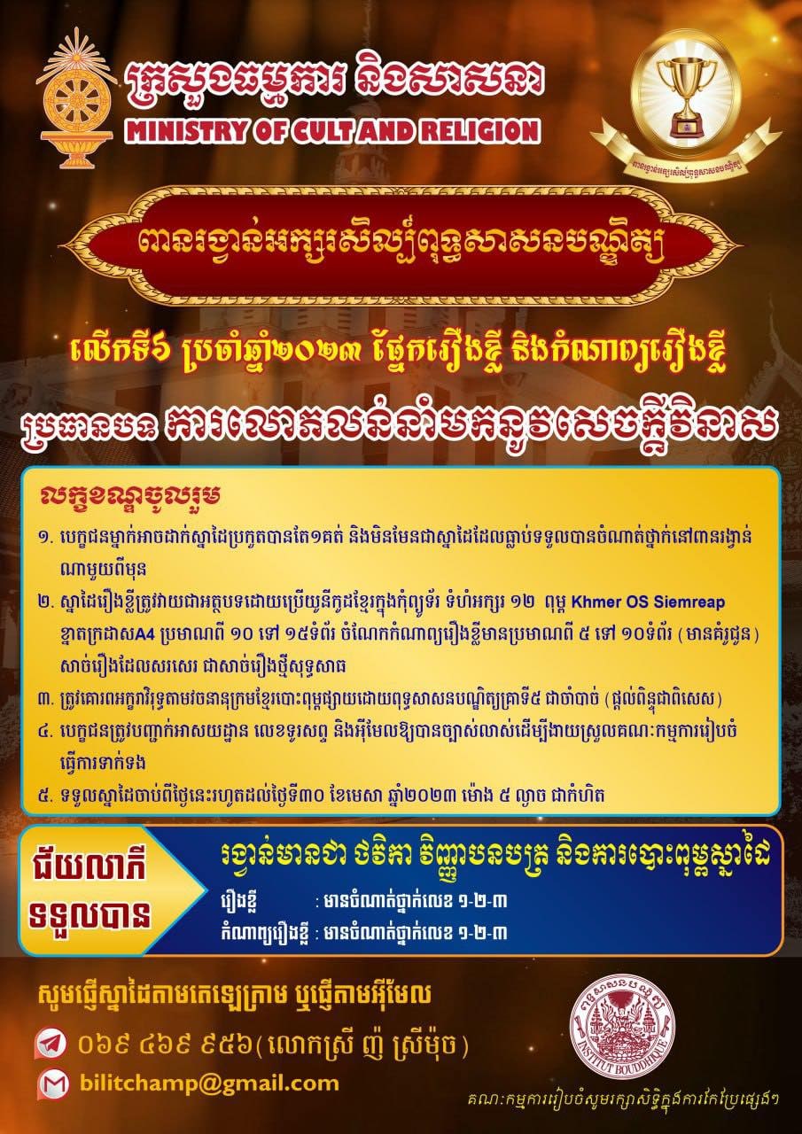 ភ្នំពេញ – ក្រោមការអនុញ្ញាតពីថ្នាក់ដឹកនាំក្រសួងធម្មការ និងសាសនា ពុទ្ធសាសនបណ្ឌិត្យកម្ពុជាបានប្រកាសទទួលស្នាដៃពានរង្វាន់អក្សរសិល្ប៍ពុទ្ធសាសនបណ្ឌិត្យលើកទី៦ ឆ្នាំ២០២៣ ក្រោមប្រធានបទ «ការលោភលន់នាំមកនូវសេចក្ដីវិនាស» ក្នុងទម្រង់ជារឿងខ្លី និងកំណាព្យរឿងខ្លី។