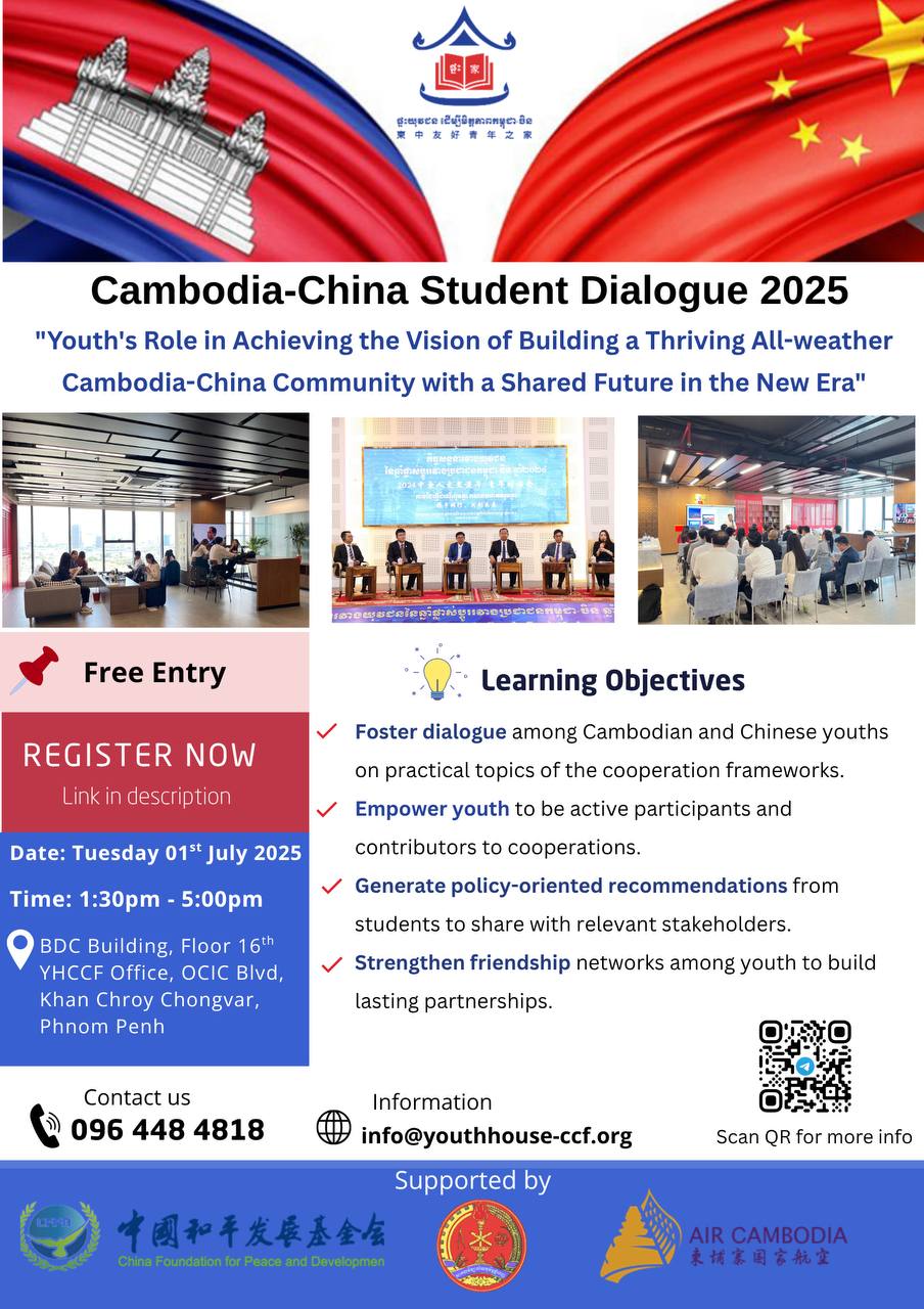 កម្មវិធី «កិច្ចសន្ទនាសិស្សកម្ពុជា-ចិន ឆ្នាំ ២០២៥» ដែលជាព្រឹត្តិការណ៍ផ្តល់នូវវេទិកាពិសេសមួយសម្រាប់យុវជនក្នុងការចូលរួមក្នុងការផ្លាស់ប្តូរការគិត ពង្រីកទស្សនៈ និងរួមចំណែកយ៉ាងសកម្មចំពោះអនាគតនៃទំនាក់ទំនងកម្ពុជា-ចិន កំពុងប្រកាសស្វាគមន៍អ្នកចូលរួម។