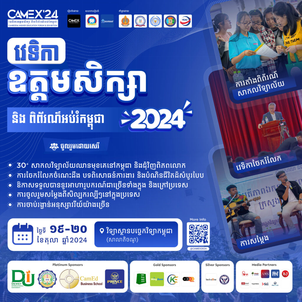 “វេទិកាឧត្តមសិក្សា និងពិព័រណ៍អប់រំកម្ពុជា” ឬ “Cambodia Higher Education Forum & Exhibition” សម្រាប់ឆ្នាំ២០២៤នេះ គ្រោងនឹងប្រព្រឹត្តទៅនាថ្ងៃទី១៩-២០ ខែតុលា ឆ្នាំ២០២៤ នៅ វិទ្យាស្ថានបច្ចេកវិទ្យាកម្ពុជា (សាលាតិចណូ)។