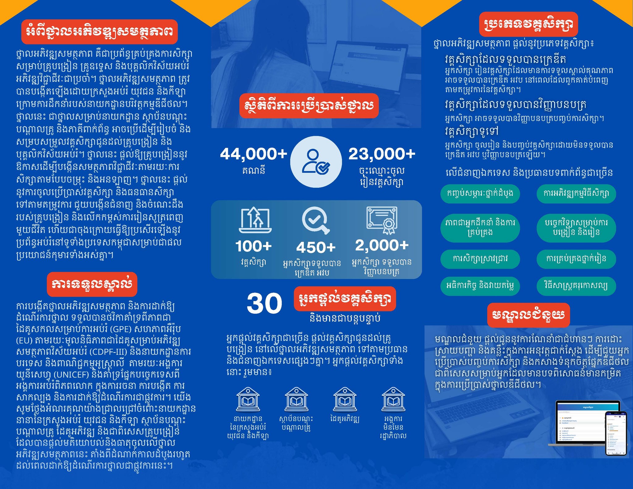 បើតាមរដ្ឋមន្ត្រីក្រសួងអប់រំ អ្នកជំនាញផ្នែកអប់រំគ្រប់រូបទូទាំងប្រទេស អាចប្រើប្រាស់ថ្នាលអភិវឌ្ឍសមត្ថភាព ដើម្បីអភិវឌ្ឍសមត្ថភាពវិជ្ជាជីវៈរបស់ខ្លួនជាប្រចាំ សម្រាប់ជួយលើកកម្ពស់គុណភាពអប់រំដែលផ្តល់ជូនដល់សិស្សានុសិស្ស។