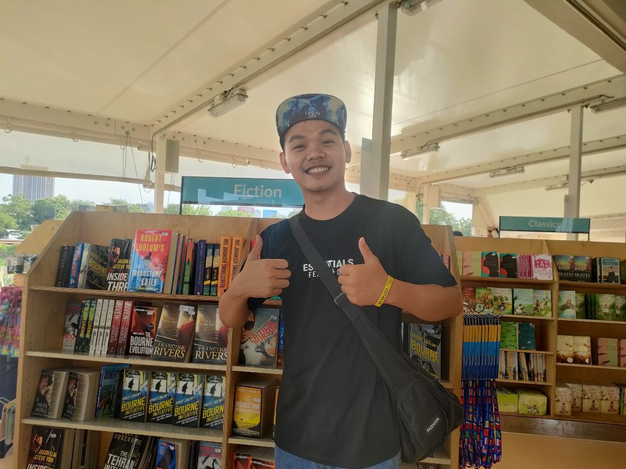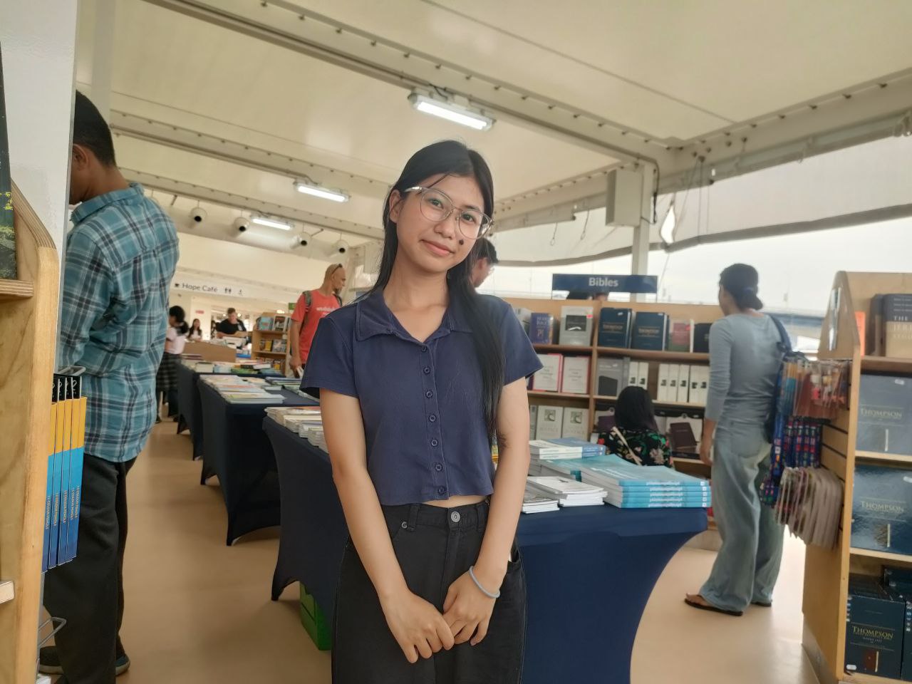 កញ្ញា ទ្រី ជូអ៊ិញ ជានិស្សិតឆ្នាំទី១ ជំនាញទំនាក់ទំនងអន្តរជាតិ នៃសាកលវិទ្យាល័យភូមិន្ទភ្នំពេញ និយាយថា កញ្ញាទទួលបានអារម្មណ៍ថ្មីមួយទៀតនៅពេលបានចូលទស្សនានាវាបណ្ណាល័យចល័ត Doulos Hope នេះ។ កញ្ញា ទ្រី ជូអ៊ិញ បន្តថា សម្រាប់សៀវដែលចាប់អារម្មណ៍ និងស្វែងរកទិញនៅទីនេះ គឺជាប្រភេទសៀវភៅដែលទាក់ទងទៅនឹងប្រវត្តិសាស្រ្តពិភពលោក។