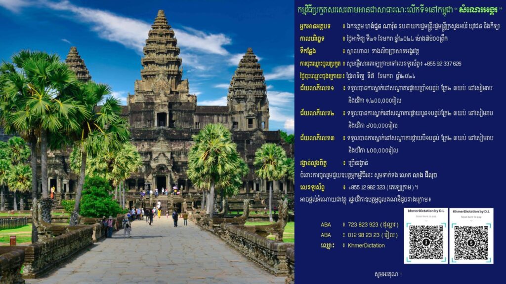 កម្ពុជាគ្រោងនឹងរៀបចំកម្មវិធីការប្រកួតសរសេរតាមអានជាសាធារណៈលើកដំបូងគេ ដែលមានឈ្មោះថា «សំណេរអង្គរ» នៅថ្ងៃទី២១ ខែមករា ឆ្នាំ២០២៤ខាងមុខ ឯស្ពានហាល ខាងលិចប្រាសាទអង្គរវត្ត ក្នុងនោះ ឯកឧត្តមឧបនាយករដ្ឋមន្រ្តី ហង់ជួន ណារ៉ុន រដ្ឋមន្រ្តីក្រសួងអប់រំ យុវជន និងកីឡា គឺជាអ្នកអានអត្ថបទសរសេរតាមអាននេះដោយផ្ទាល់។
