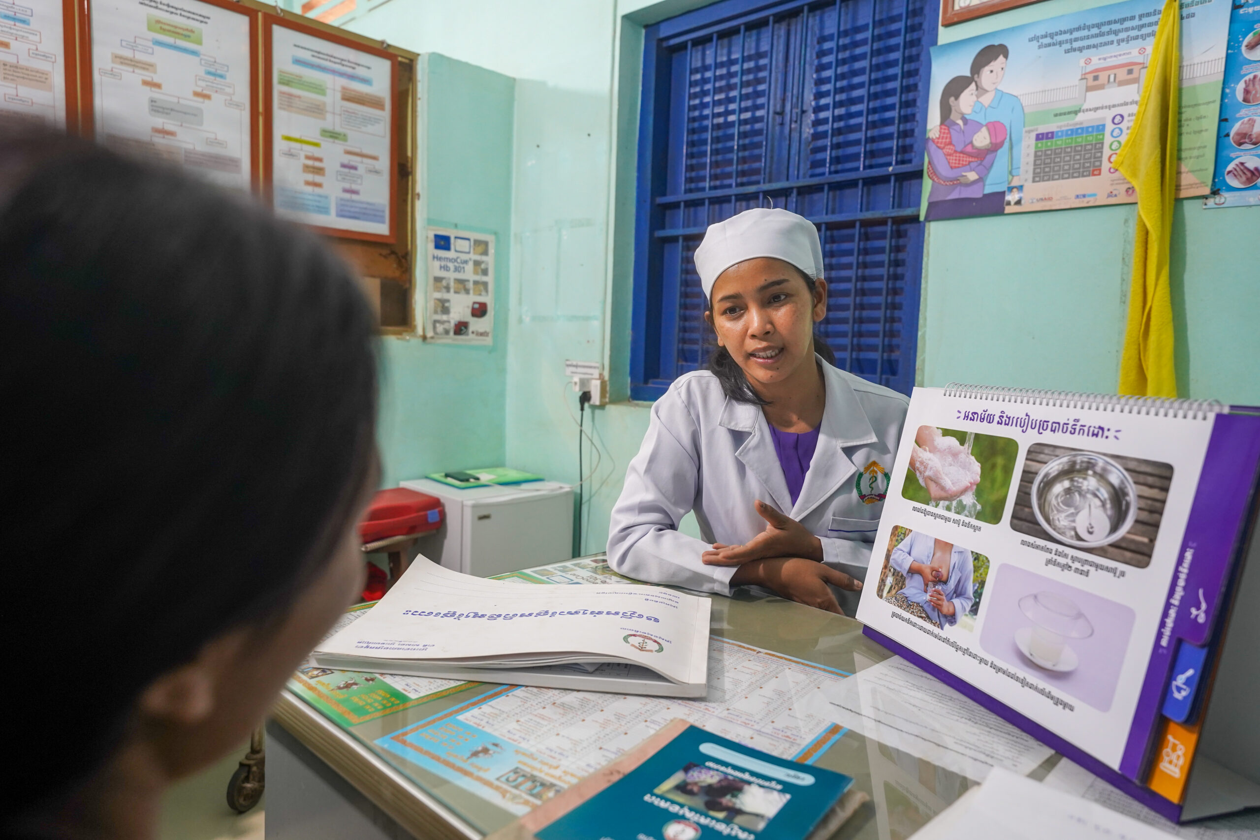 ការទទួលសេវាប្រឹក្សាការបំបៅកូនដោយទឹកដោះម្តាយ និងអាហារូបត្ថម្ភ អំឡុងពេលពិនិត្យផ្ទៃពោះនៅមណ្ឌលសុខភាពសសរស្តម្ភ ខេត្តសៀមរាប។