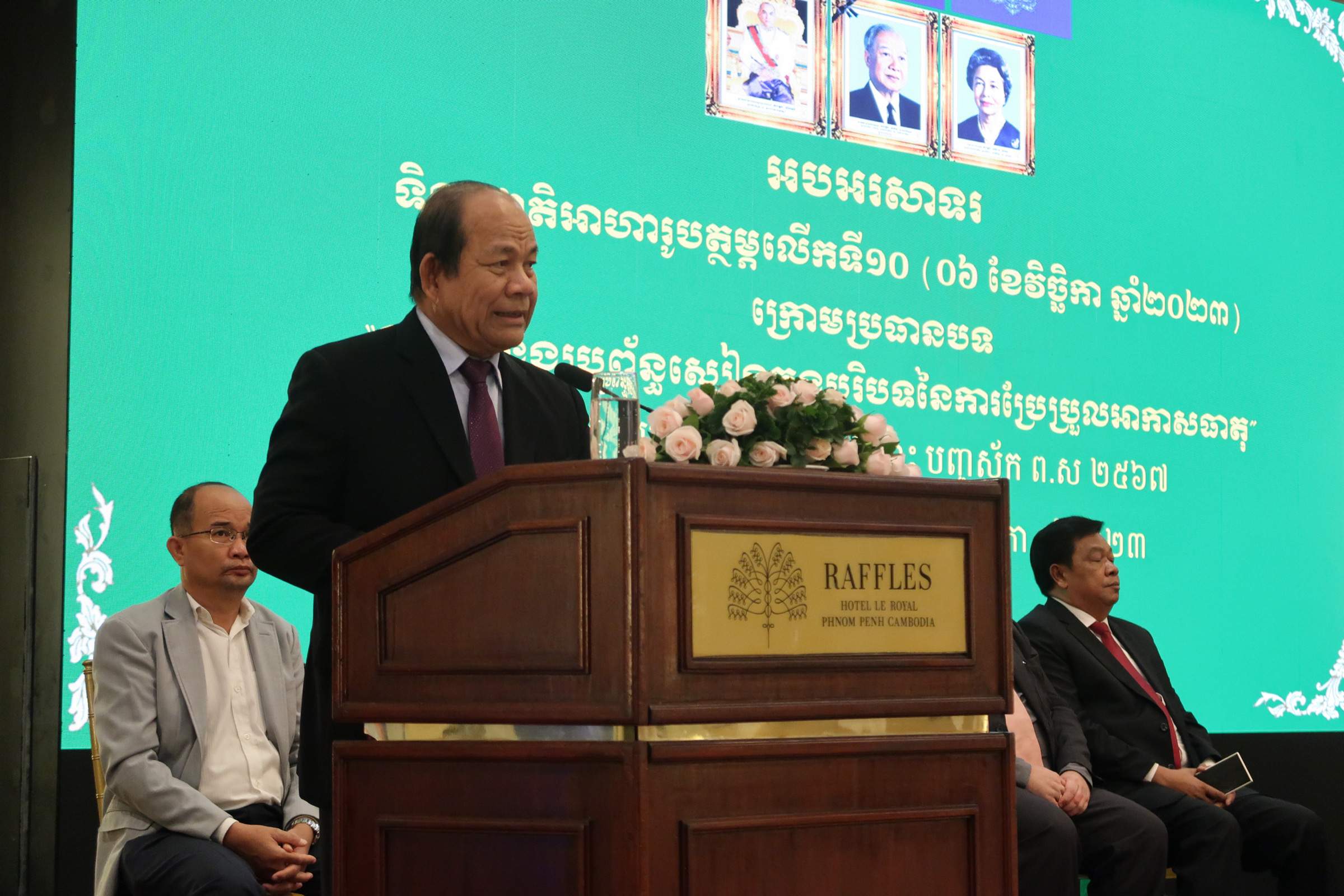 ទន្ទឹមគ្នានេះ ឯកឧត្តមបណ្ឌិតសភាចារ្យ បានបញ្ជាក់បន្ថែមថា ការប្រែប្រួលអាកាសធាតុមានឥទ្ធិពលដល់ប្រព័ន្វស្បៀងយ៉ាងខ្លាំង ជាក់ស្តែងដូចជាការផលិតស្បៀង ការកែច្នៃស្បៀង ការដឹកជញ្ជូនស្បៀងជាដើម ។ រាជរដ្ឋាភិបាលកម្ពុជាមានផែនទីបង្ហាញផ្លូវស្តីពីប្រព័ន្ធស្បៀងសម្រាប់ការអភិវឌ្ឍប្រកបដោយចីរភាពនៅកម្ពុជាឆ្នាំ២០៣០ ដែលមានចក្ខុវិស័យឆ្ពោះទៅពង្រឹងប្រព័ន្ធស្បៀងមួយឱ្យកាន់តែមានភាពរឹងមាំ ឆ្លាតវៃ ភាពធន់ បរិយាបន្ន ផ្តល់របបអាហារសុខភាព និងអាហារូបត្ថម្ភ ។
