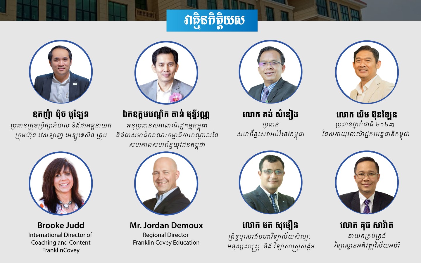 ចំពោះវាគ្មិនរួមមានឧកញ៉ា ប៉ិច បូឡែន អគ្គនាយកក្រុមហ៊ុនវេសឡាញ អេឌ្យូខេសិន គ្រុប និងជាប្រធានហ្វ្រែងខ្លីន ខូវី អេឌ្យូខេសិន ប្រចាំនៅកម្ពុជា, លោក មត សុមឿន ព្រឹទ្ធបុរសរងមហាវិទ្យាល័យ សិល្បៈមនុស្សសាស្ត្រ និងវិទ្យាសាស្ត្រសង្គម នៃសាកលវិទ្យាល័យ CamTech, ឯកឧត្តមបណ្ឌិត តាន់ មុន្នីវណ្ណ អនុប្រធានសភាពាណិជ្ជកម្មកម្ពុជា និងជាសមាជិកគណៈកម្មាធិការកណ្តាលនៃសហភាពសហព័ន្ធយុវជនកម្ពុជា, លោក ឃីម ប៊ុនឡែន ប្រធានថ្នាក់ជាតិ ២០២៣ នៃសភាយុវពាណិជ្ជករអន្តរជាតិកម្ពុជា, លោក គុជ សាវ៉ាត នាយកគ្រប់គ្រងវិទ្យាស្ថានអភិវឌ្ឍវិស័យអប់រំ, លោក គង់ សំនៀង ប្រធានសហព័ន្ធសេវាអប់រំនៅកម្ពុជា, Ms. Brook Judd, International Director of Coaching and Content, Franklin Covey Education (USA), Mr. Jordan Demoux, Regional Director of Franklin Covey Education, USA។