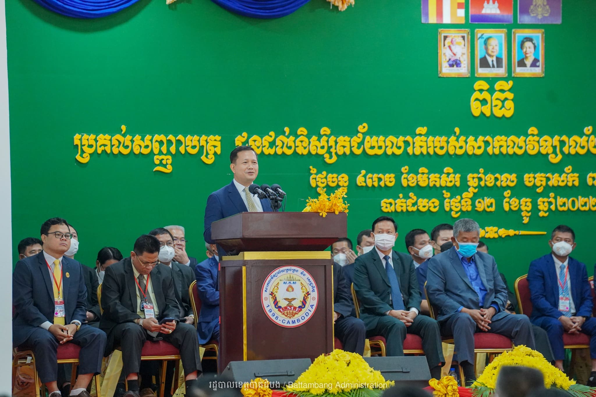 បាត់ដំបង – នៅក្នុងពិធីប្រគល់សញ្ញាបត្រជូនដល់និស្សិតជ័យលាភីនៅសាកលវិទ្យាល័យគ្រប់គ្រង និងសេដ្ឋកិច្ច (UME) សាខាខេត្តបាត់ដំបង នាព្រឹកថ្ងៃចន្ទ ឯកឧត្តមបណ្ឌិត ហ៊ុន ម៉ាណែត អគ្គមេបញ្ជាការរងនៃកងយោធពលខេមរភូមិន្ទ និងជាមេបញ្ជាការកងទ័ពជើងគោក មានប្រសាសន៍ថា ធនធានមនុស្សជាទ្រព្យដ៏សំខាន់ និងចាំបាច់បំផុតសម្រាប់ដំណើរការកសាងអភិវឌ្ឍប្រទេសឱ្យរីកចម្រើនរុងរឿងប្រកបដោយចីរភាព និងនិរន្តរភាព ។