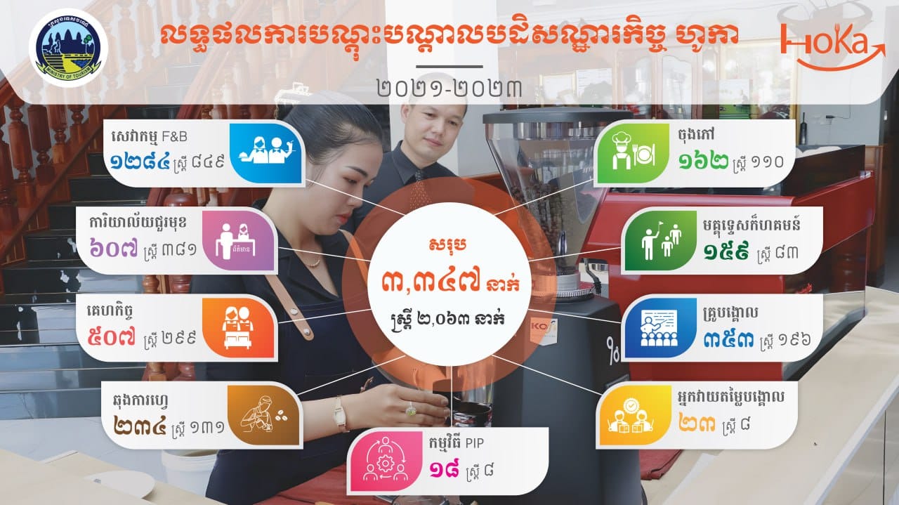 សូមបញ្ជាក់ថា កម្មវិធីបណ្តុះបណ្តាលបដិសណ្ឋារកិច្ចកម្ពុជា (HoKa) គឺជាផ្នែកមួយរបស់ កម្មវិធីអភិវឌ្ឍន៍ជំនាញ (SDP) ដើម្បីធ្វើការបណ្តុះបណ្តាលជំនាញបដិសណ្ឋារកិច្ចដល់យុវជន យុវនារី អ្នកជំនាញកម្រិតទាប ម្ចាស់អាជីវកម្ម និងសហគមន៍ទេសចរណ៍ នៅខេត្តចំនួន៥ នៅភូមិភាគឦសាន និងខេត្តចំនួន៥ទៀតនៅជុំវិញបឹងទន្លេសាប៕