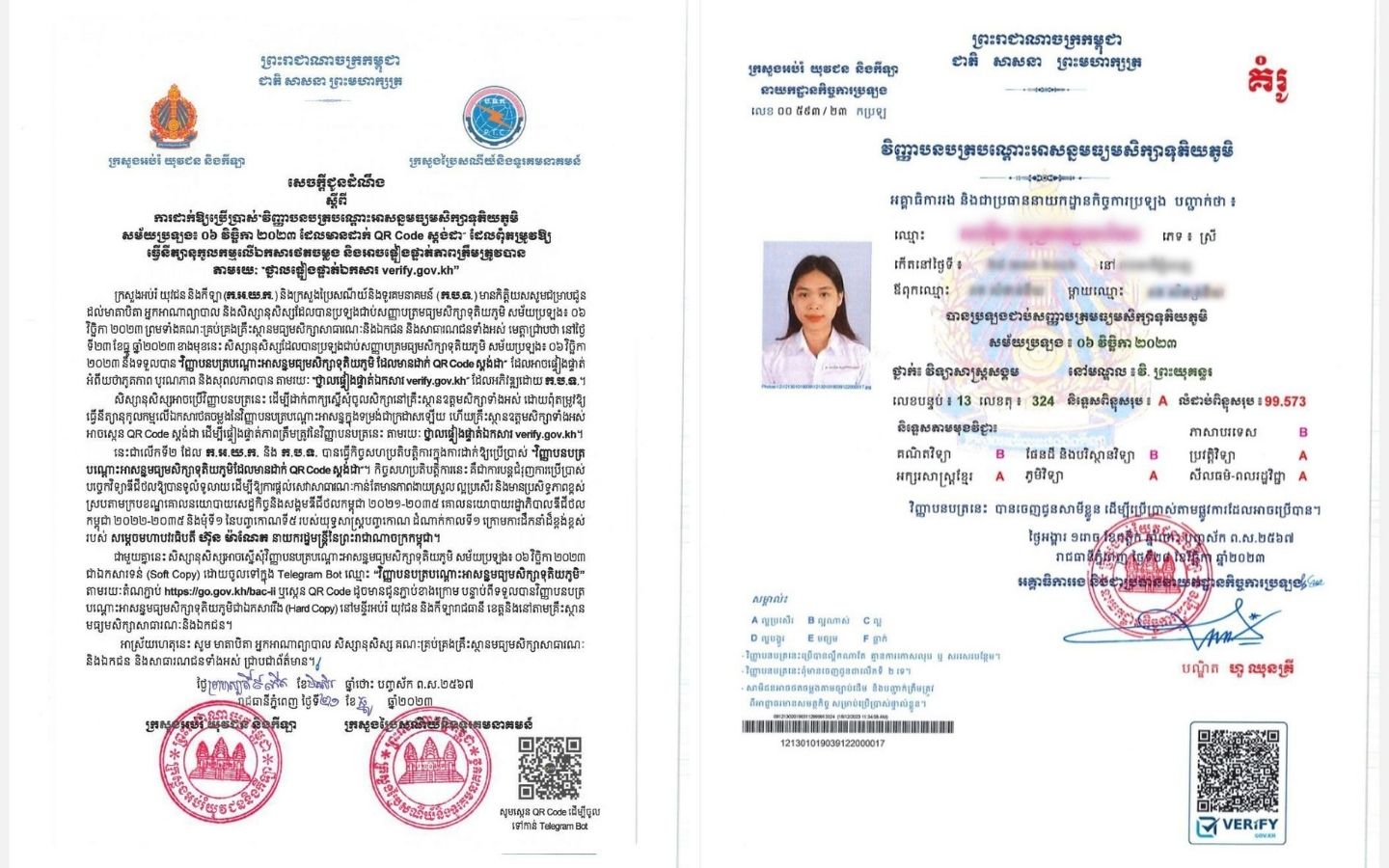 នៅ​ថ្ងៃទី២៣ ខែធ្នូ ឆ្នាំ២០២៣ សិស្សានុសិស្សដែលបានប្រឡង​ជាប់សញ្ញាបត្រ​មធ្យមសិក្សា​ទុតិយភូមិ សម័យ​ប្រឡង ៖ ០៦ វិច្ឆិកា ២០២៣ នឹង​ទទួលបាន វិញ្ញាបត្របណ្តោះអាសន្ន​ ដែលមានដាក់ QR Code ស្តង់ដារ ដែលអាច​ផ្ទៀងផ្ទាត់​អំពីយថាភូតភាព បូរណភាព និង​សុពលភាព​បាន តាមរយៈ ថ្នាលផ្ទៀងផ្ទាត់ឯកសារ verify.gov.kh ដែលអភិវឌ្ឍដោយក្រសួងប្រៃសណីយ៍ និងទូរគមនាគមន៍។