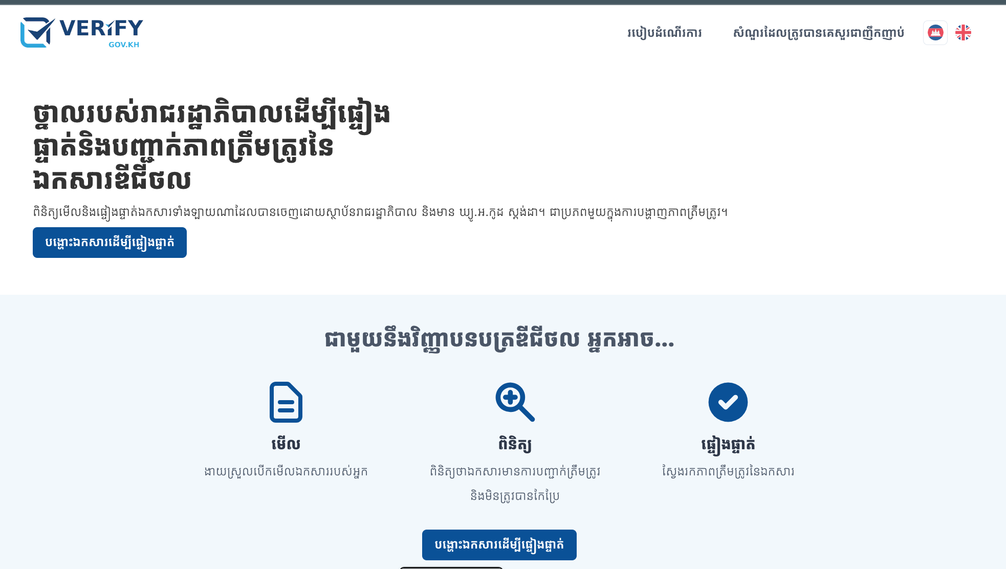 សូមបញ្ជាក់ថា ថ្នាលផ្អៀងផ្ទាត់ឯកសារ verify.gov.kh ដែលអភិវឌ្ឍដោយ​ក្រសួងប្រៃសណីយ៍ និង​ទូរគមនាគមន៍ ត្រូវ​បានរាជរដ្ឋាភិបាលប្រកាស​ដាក់ឱ្យ​ប្រើប្រាស់តាមរយៈអនុក្រឹត្យ លេខ ៥២ អនក្រ.បក ចុះថ្ងៃទី៣ ខែមីនា ឆ្នាំ២០២៣ ក្នុងគោលបំណងលុបបំបាត់ការក្លែង​បន្លំឯកសារ ផ្តល់ភាពងាយស្រួលក្នុងការប្រើប្រាស់ និង​ផ្ទៀងផ្ទាត់ភាពត្រឹមត្រូវ នៃឯកសារ ផ្តល់ទំនុកចិត្ត ចំណេញពេលវេលា និង​កាត់បន្ថយ​ការ​ចំណាយ​នានា ព្រមទាំង​ជំរុញ​ការ​ធ្វើបរិវត្តកម្មឌីជីថល​សេវាសាធារណៈ។