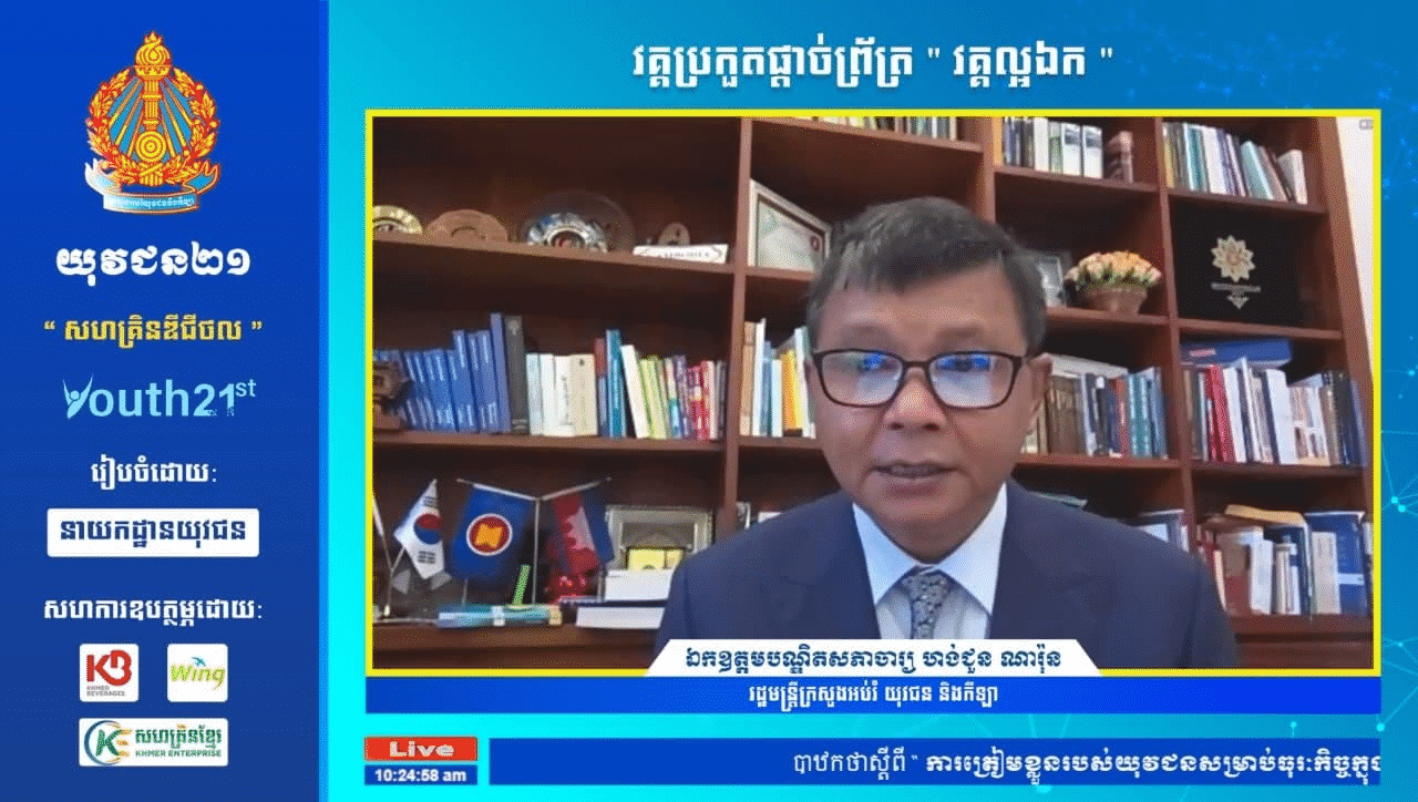 ភ្នំពេញ – ឯកឧត្តមបណ្ឌិតសភាចារ្យ ហង់ជួន ណារ៉ុន រដ្ឋមន្រ្តីក្រសួងអប់រំ យុវជន និងកីឡា មានប្រសាសន៍ថា បំណិនសតវត្សរ៍ទី២១ បានដើរតួនាទីយ៉ាងសំខាន់នៅក្នុងទីផ្សារការងារបច្ចុប្បន្នដែលយុវជនកម្ពុជាត្រូវមាន, លើសពីនេះ វាក៏ជាជំនាញដែលជួយពង្រឹង និងអភិវឌ្ឍសមត្ថភាពសិស្សានុសិស្ស ដើម្បីទទួលបានជោគជ័យក្នុងអាជីពការងារនាសម័យបច្ចេកវិទ្យាទំនើបផងដែរ ។ ការលើកឡើងរបស់ឯកឧត្តមបណ្ឌិតសភាចារ្យ បានធ្វើឡើងក្នុងឱកាសអញ្ជើញជាអធិបតី ក្នុងការប្រកួតផ្ដាច់ព្រ័ត្រកម្មវិធី យុវជន២១ កាលពីពេលថ្មីៗនេះ។