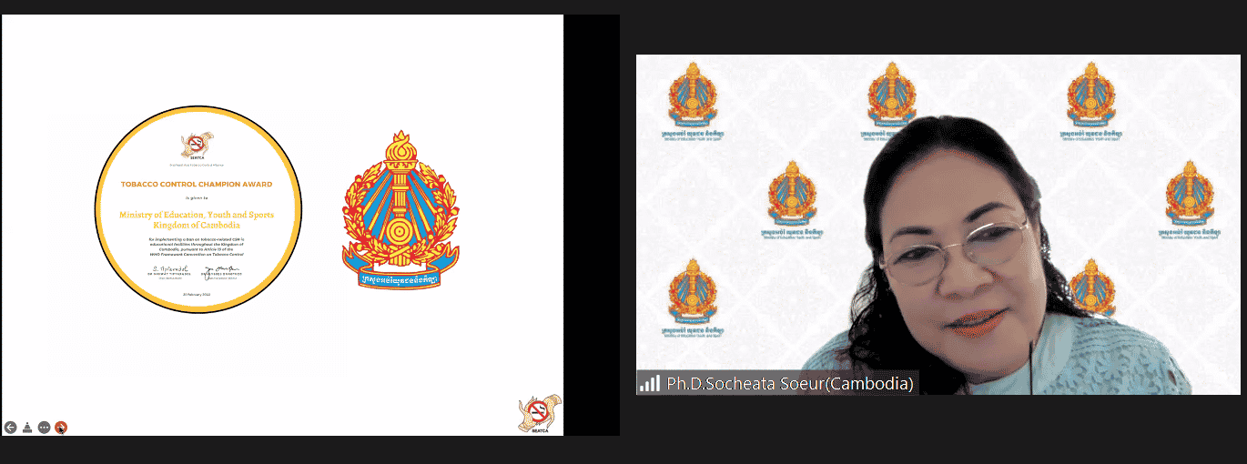 ភ្នំពេញ – ក្រសួងអប់រំ យុវជន និងកីឡា និងអាជ្ញាធរជាតិប្រយុទ្ធប្រឆាំងគ្រឿងញៀន ទទួលបានពានកោតសរសើរពីសម្ព័ន្ធត្រួតពិនិត្យផលិតផលថ្នាំជក់អាស៊ីអាគ្នេយ៍ (SEATCA) ក្នុងនាមជាស្ថាប័នរដ្ឋាភិបាលអនុវត្តការត្រួតពិនិត្យផលិតផលថ្នាំជក់បានល្អនៅកម្ពុជា ។ កម្មវិធីនេះ រៀបចំឡើងដោយសម្ព័ន្ធត្រួតពិនិត្យផលិតផលថ្នាំជក់ ក្នុងគោលបំណងផ្ដល់ពានកោតសរសើរដល់ភ្នាក់ងារត្រួតពិនិត្យថ្នាំជក់ក្នុងតំបន់អាស៊ាន និងសមិទ្ធផលនានារបស់ប្រទេសអាស៊ានធ្វើបានក្នុងបរិបទកូវីដ-១៩ រៀបចំតាមប្រព័ន្ធអនឡាញ នាព្រឹកថ្ងៃពុធនេះ ។