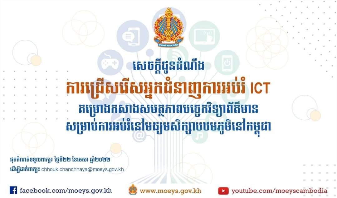 ភ្នំពេញ – ក្រសួងអប់រំ យុវជន និងកីឡា ប្រកាសជ្រើសរើសអ្នកជំនាញការអប់រំ ICT សម្រាប់គម្រោង “កសាងសមត្ថភាពបច្ចេកវិទ្យាព័ត៌មានសម្រាប់ការអប់រំនៅមធ្យមសិក្សាបឋមភូមិនៅកម្ពុជា” ចំនួន០១រូប ដើម្បីបម្រើការជាអ្នកប្រឹក្សាយោបល់រយៈពេលខ្លីចំនួន ២ឆ្នាំ ឬ២៤ ខែ។