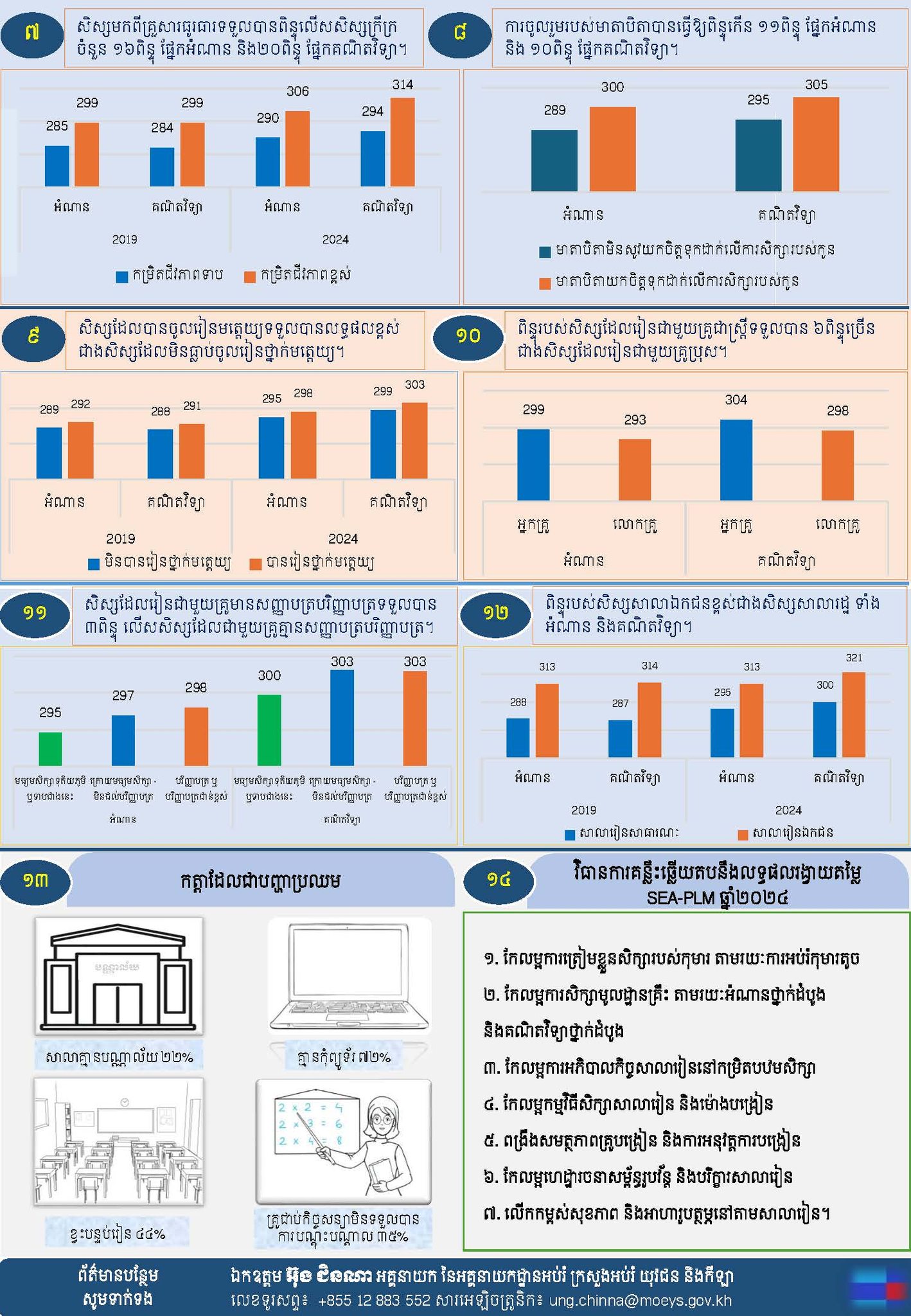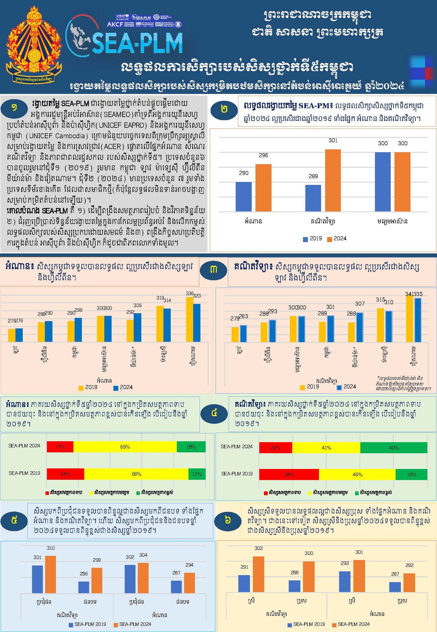 តាមរបាយការណ៍ សិស្ស​កម្ពុជា​មានពិន្ទុ​ជាមធ្យម​ផ្នែក​អំណាន​កើនឡើង ៦ពិន្ទុ (២៩០ក្នុងឆ្នាំ២០១៩ កើន​ដល់២៩៦ក្នុងឆ្នាំ​២០២៤) និង​ពិន្ទុ​ជាមធ្យមផ្នែក​គណិតវិទ្យា​កើនឡើង ១២ពិន្ទុ (២៨៩ក្នុងឆ្នាំ២០១៩ កើនដល់ ៣០១ក្នុង​ឆ្នាំ២០២៤)។ បើប្រៀបធៀបជាមួយ​ប្រទេស​ក្នុងតំបន់ សិស្ស​កម្ពុជា និង​មីយ៉ាន់ម៉ា ទទួល​បានពិន្ទុកើនឡើង ចំណែកប្រទេស​ឡាវ និងហ្វីលីពីន ប្រែប្រួលតិចតួច រីឯប្រទេស​ម៉ាឡេស៊ី និង​វៀតណាម ទទួលបាន​ពិន្ទុ​សិស្ស​ថយចុះ។
